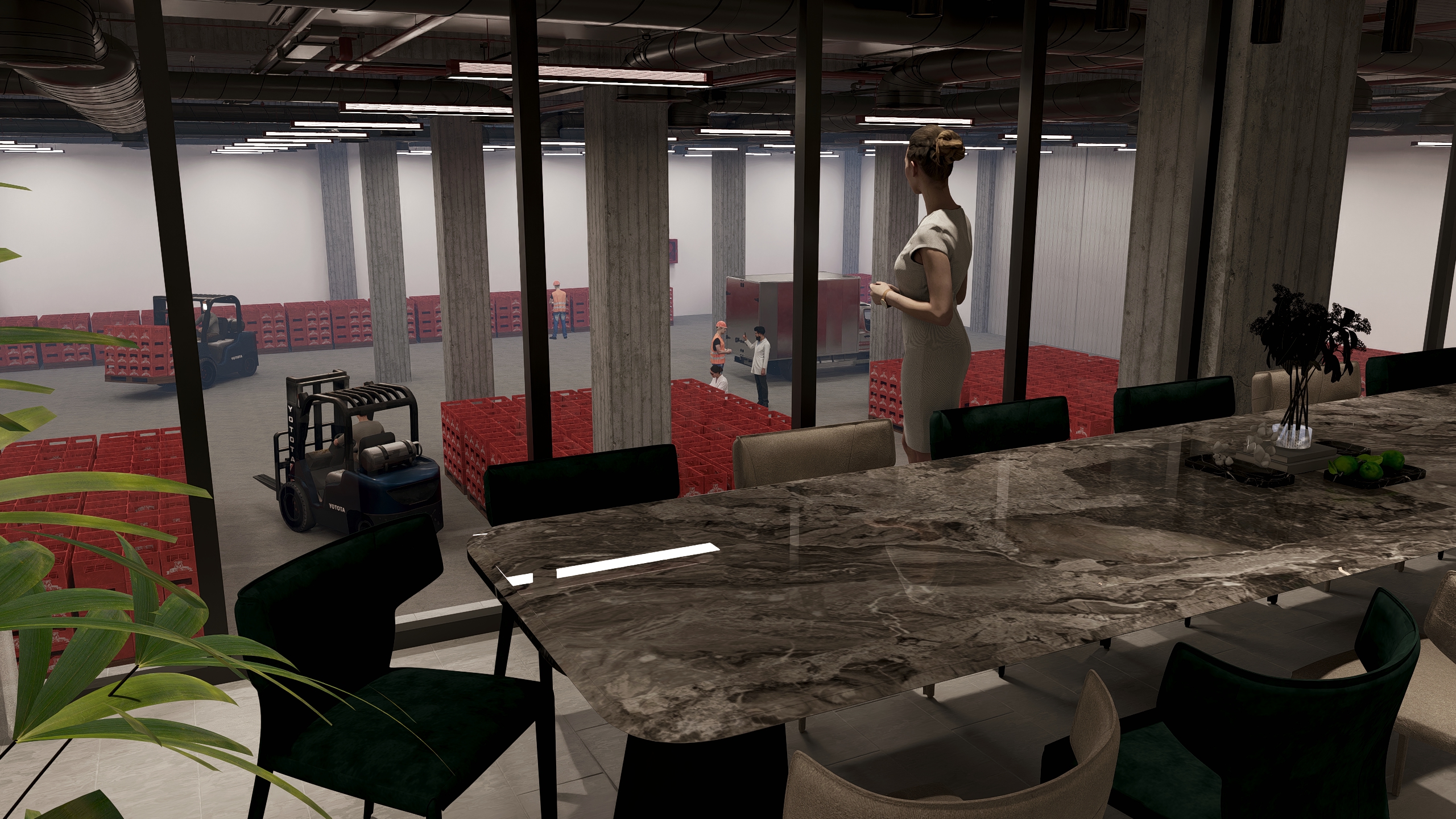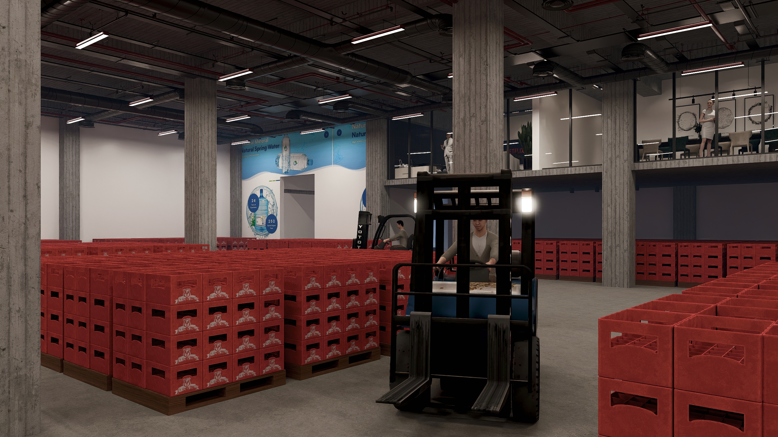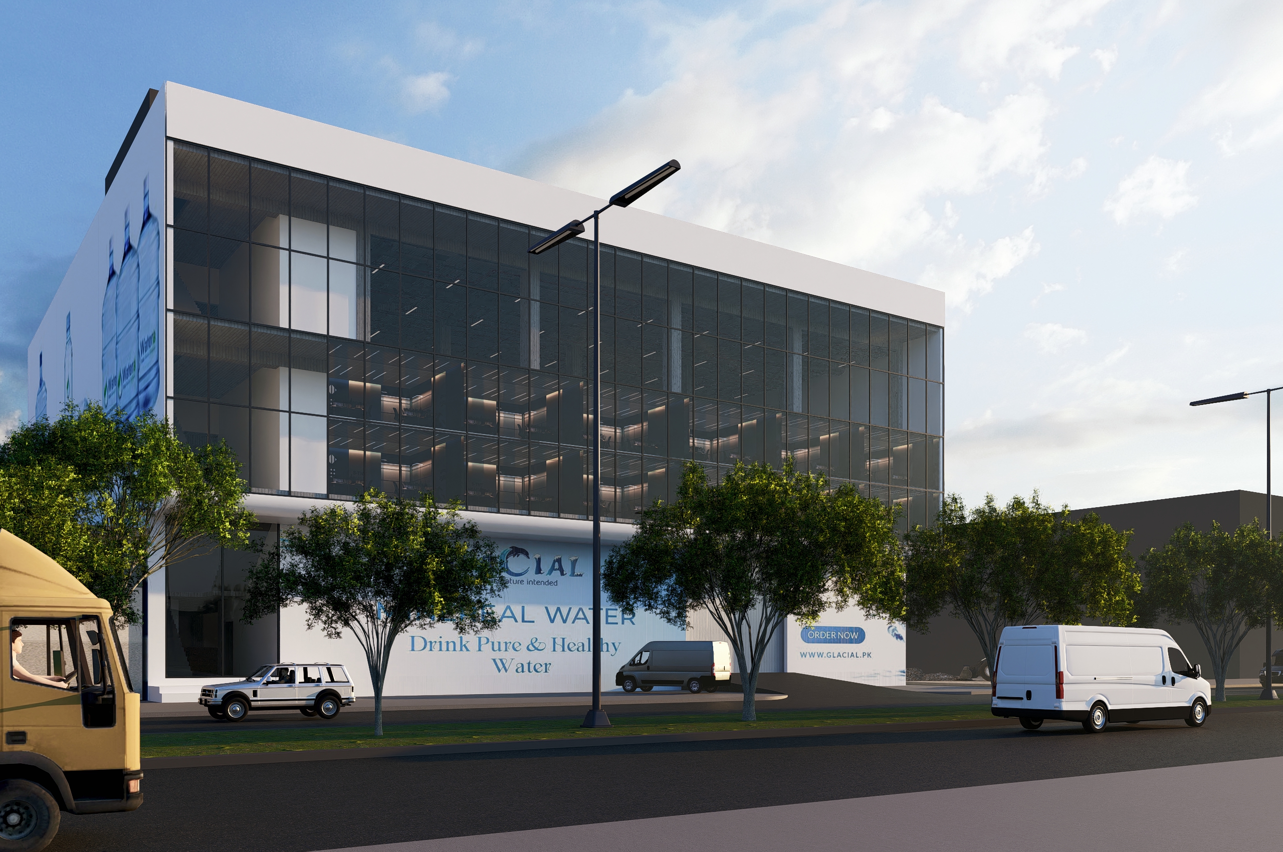 يتضمن المشروع منظومة تشغيلية متكاملة تشمل مولدة كهرباء وبويلر ومنظومة فلترة للمياه المعدنية بسعة 10,000 لتر/ساعة. تم مراعاة متطلبات التشغيل الثقيل بتصميم أحمال متحركة لكل طابق حتى 300 طن، وتوفير كمبريسورات هواء ومرافق كهرباء وماء كاملة. التشطيبات تشمل سيراميك وأرضيات مخصصة للاستخدام الغذائي، مع درج ومصعد خدمة مخصصين لتسهيل العمليات اللوجستية