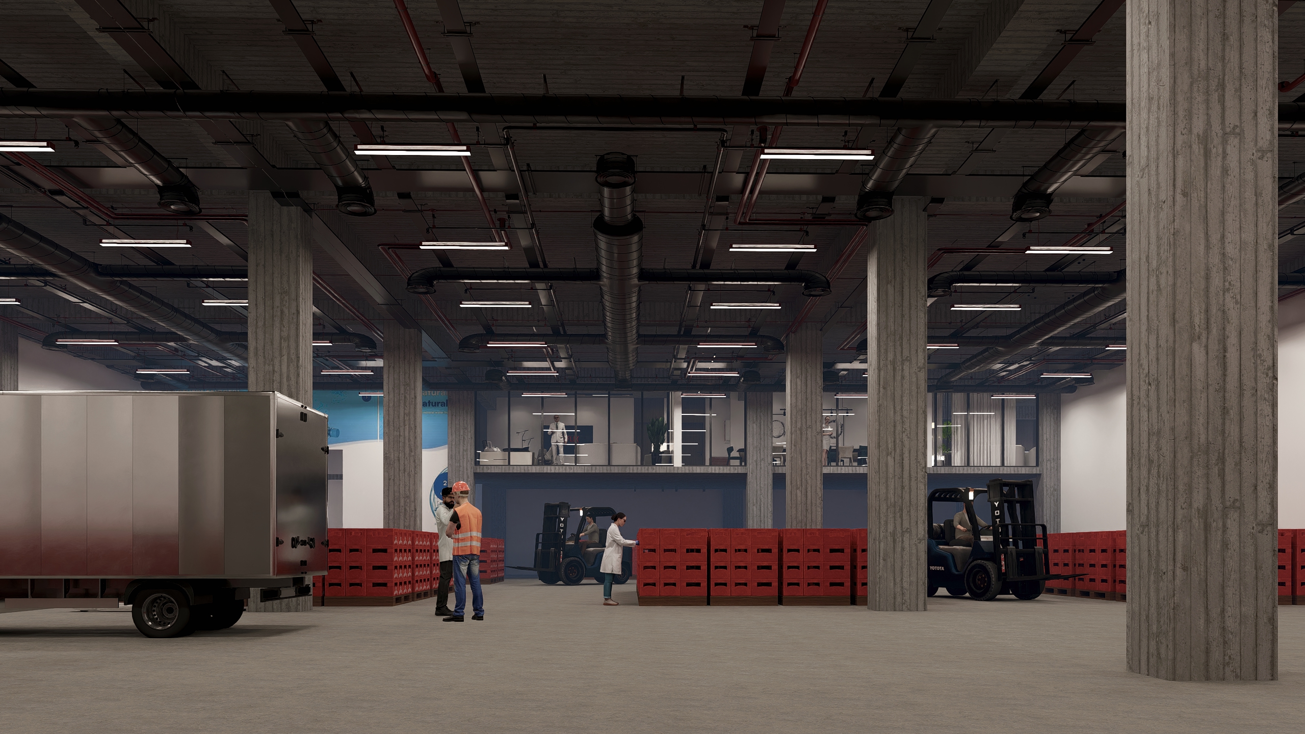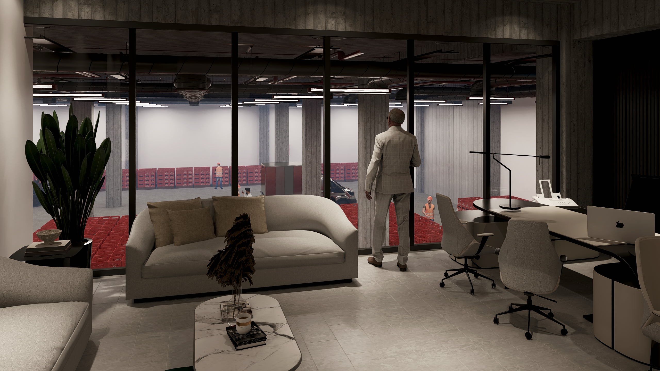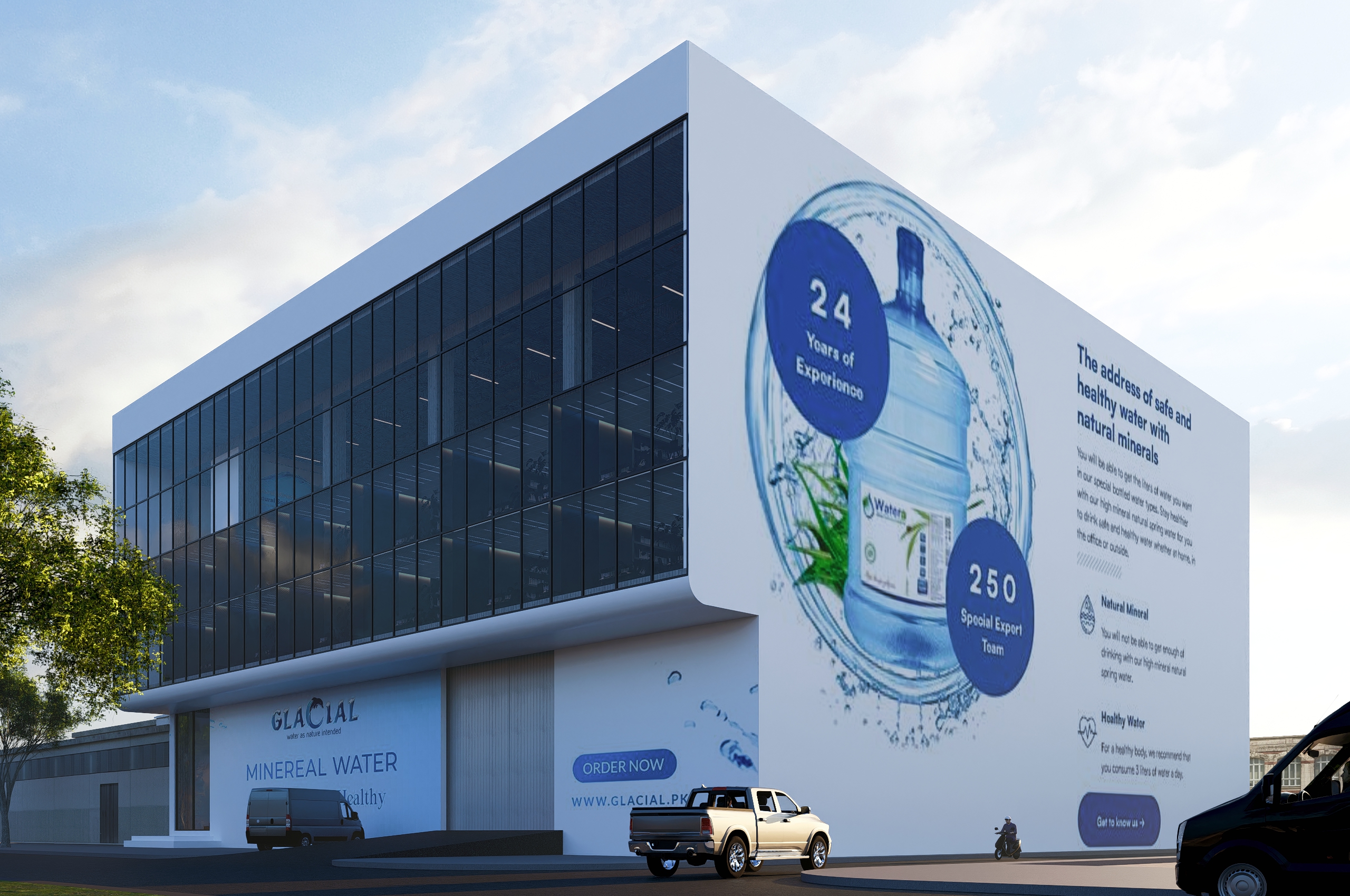 يتضمن المشروع منظومة تشغيلية متكاملة تشمل مولدة كهرباء وبويلر ومنظومة فلترة للمياه المعدنية بسعة 10,000 لتر/ساعة. تم مراعاة متطلبات التشغيل الثقيل بتصميم أحمال متحركة لكل طابق حتى 300 طن، وتوفير كمبريسورات هواء ومرافق كهرباء وماء كاملة. التشطيبات تشمل سيراميك وأرضيات مخصصة للاستخدام الغذائي، مع درج ومصعد خدمة مخصصين لتسهيل العمليات اللوجستية