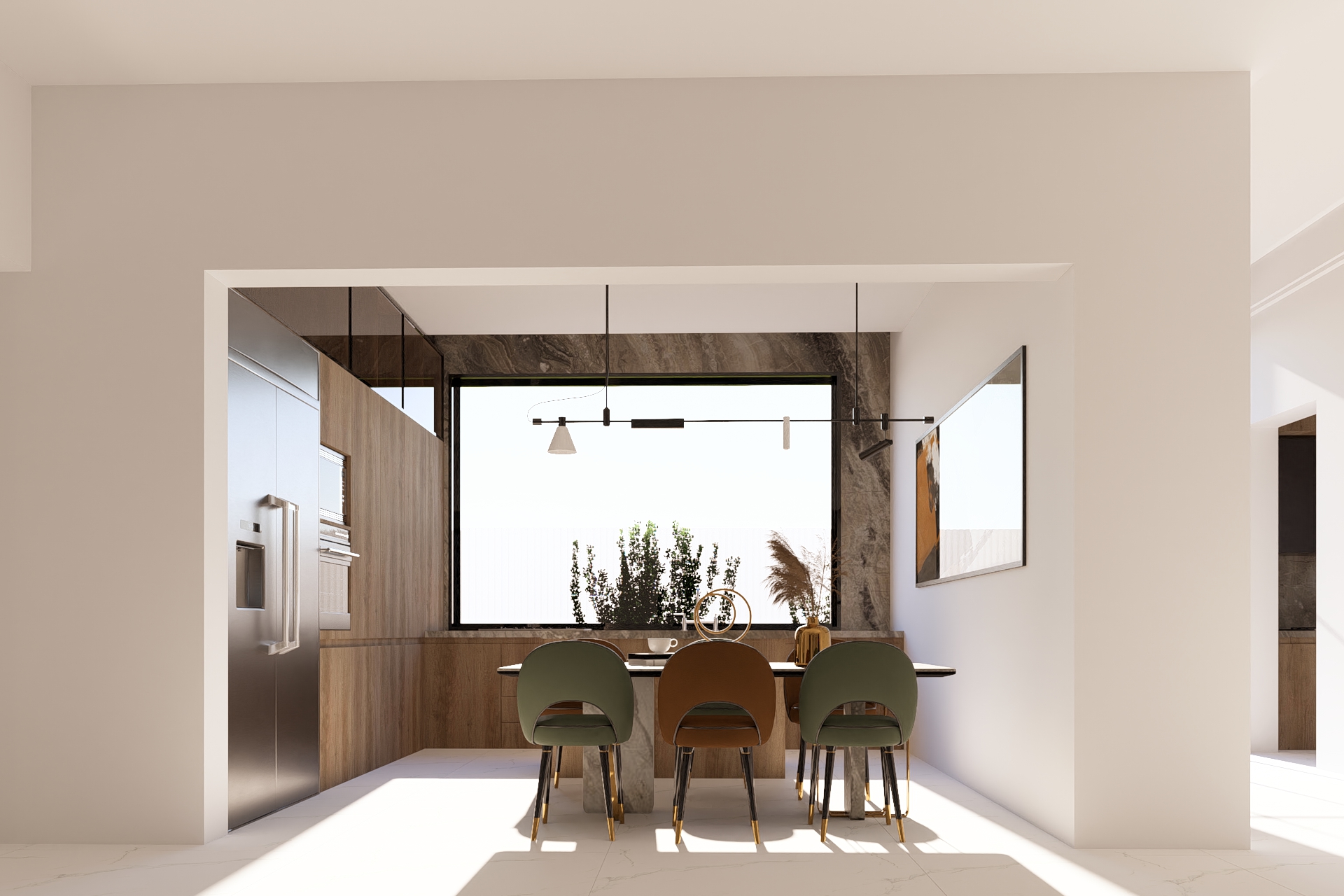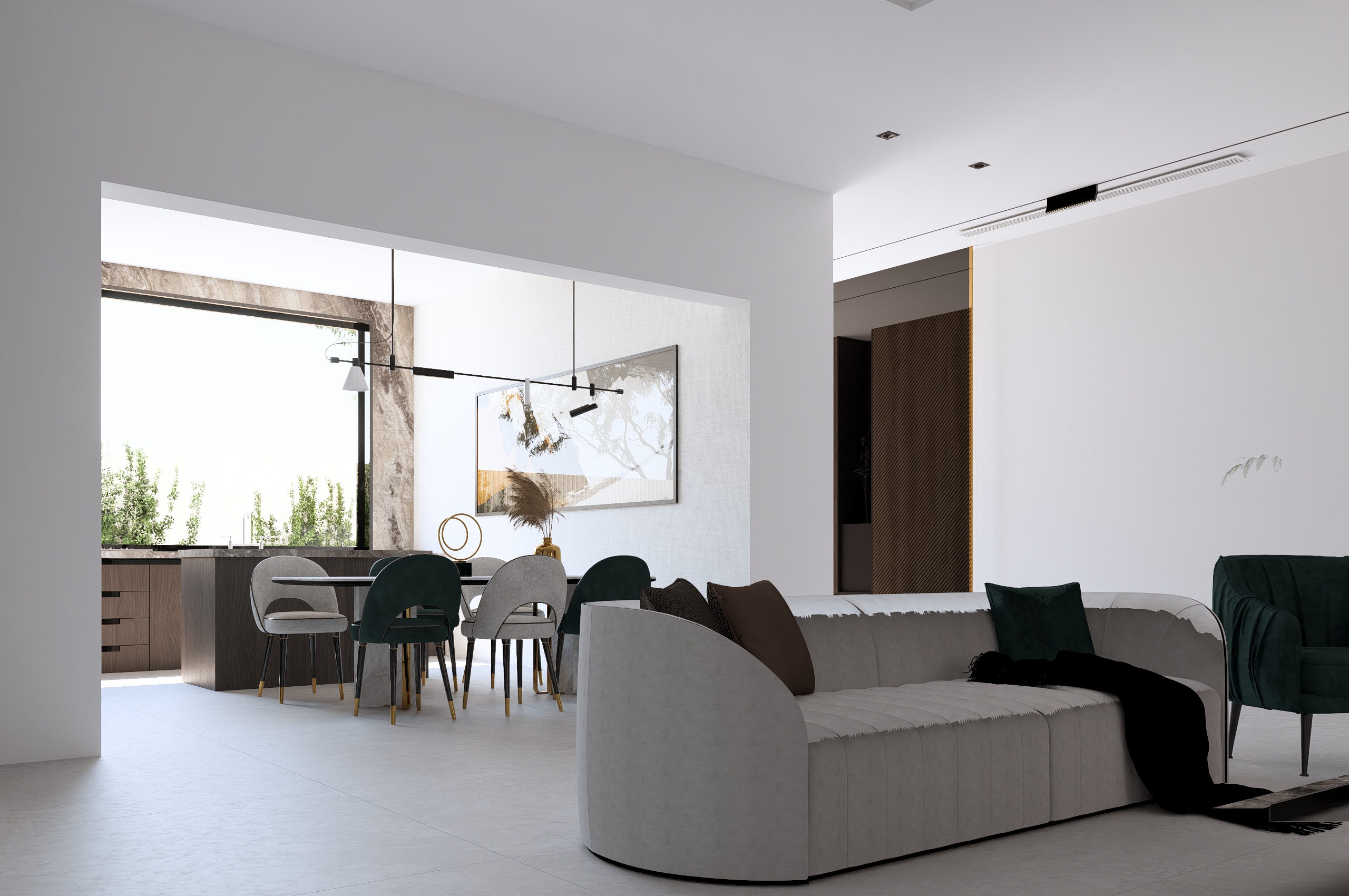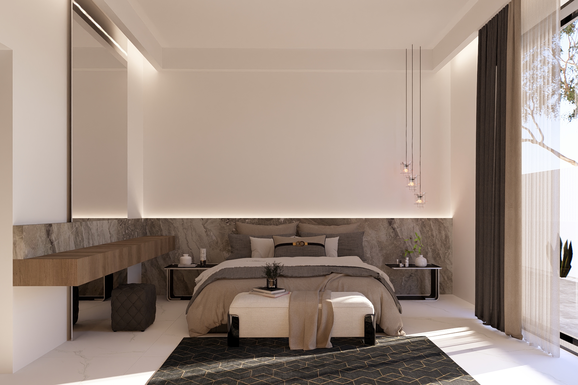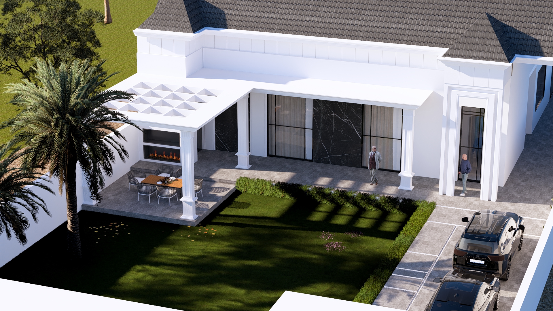 المدخل الرئيسي يتميز بارتفاعه المهيب وانسيابية انتقاله نحو الفضاء الداخلي، فيما تضيف جلسة الحديقة الجانبية المظللة لمسة حياة وجمال، مثالية للقاءات العائلية والراحة الخارجية يعبّر المشروع عن مفهوم الفيلا العملية الراقية التي تجمع بين الهدوء، البساطة، والفخامة المعمارية في آنٍ واحد، لتقدّم نموذجاً معاصراً للسكن المريح المتكامل