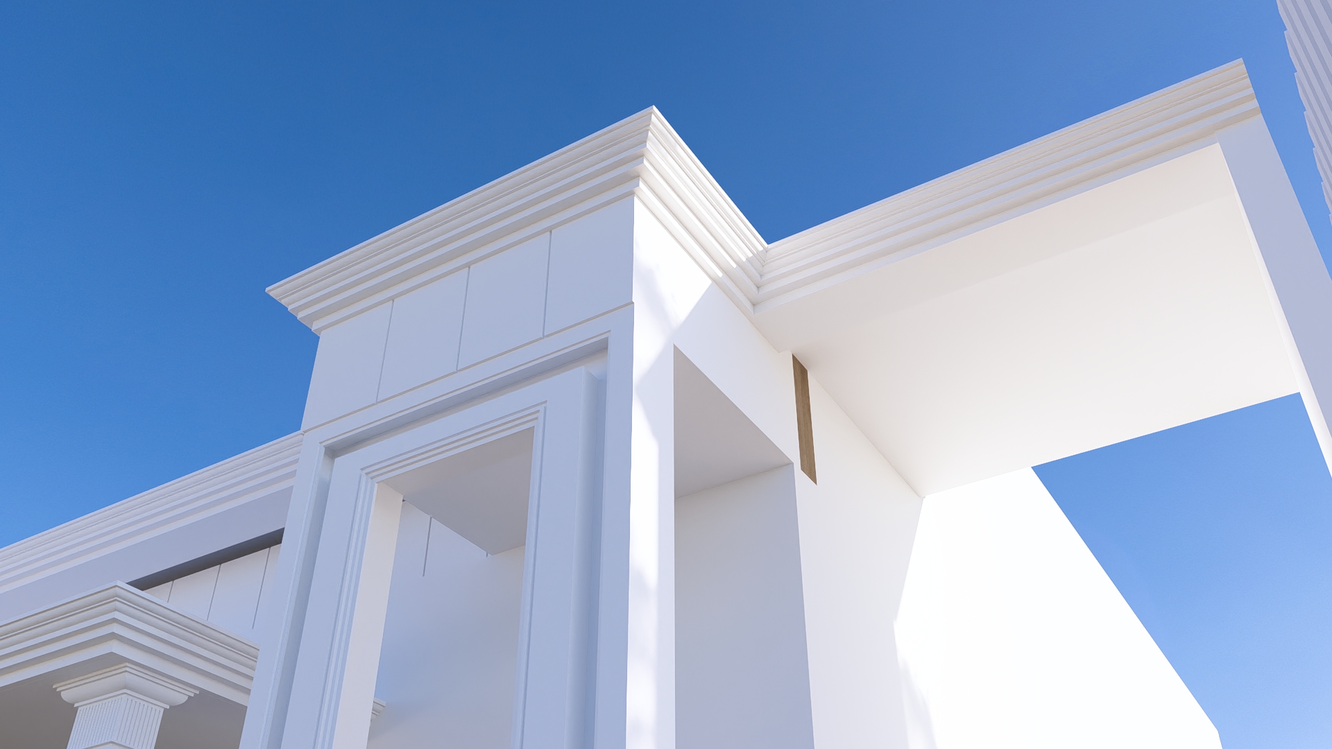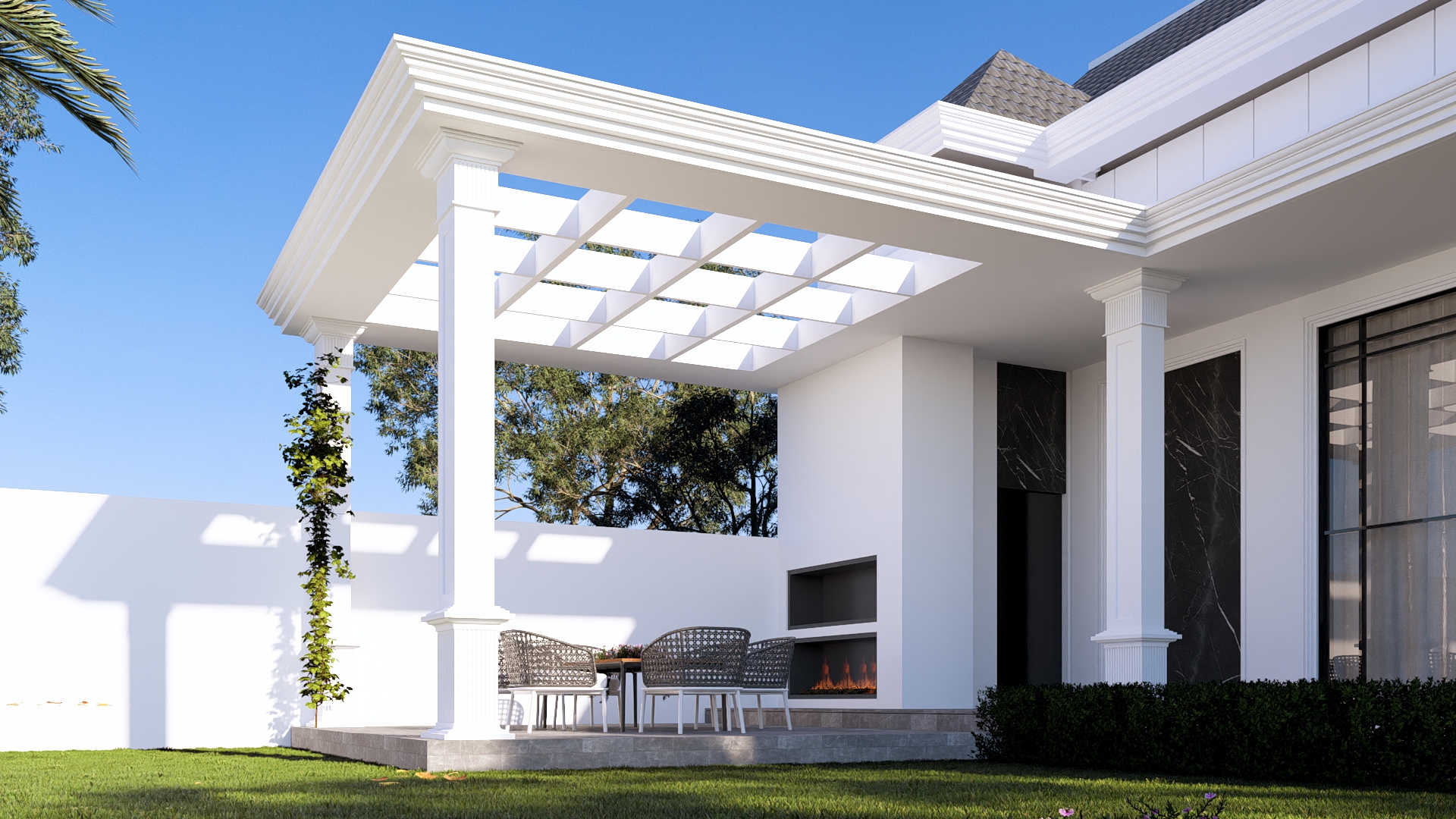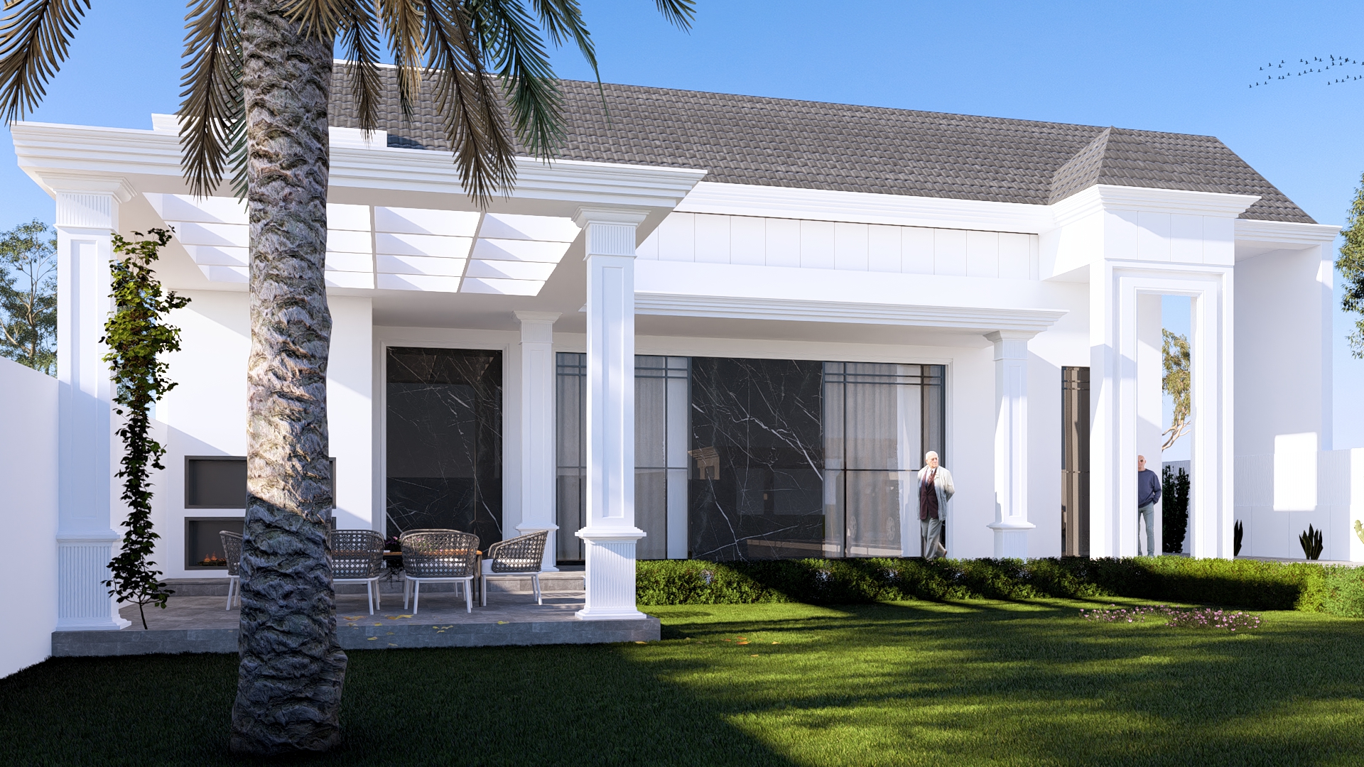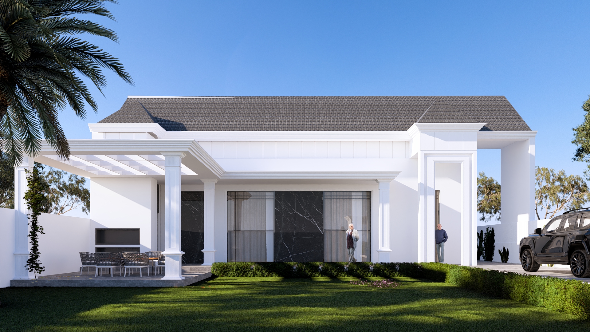 واجهة بتكوين هندسي متوازن تجمع بين الخطوط الكلاسيكية الهادئة واللمسات العصرية الأنيقة، حيث تبرز الأعمدة البيضاء بتفاصيل دقيقة تكمّل السقف المائل بلون رمادي أنيق يعتمد التصميم على تناغم الألوان والمواد بين الأبيض والرخام الأسود، ليمنح الواجهة حضوراً راقياً وعمقاً بصرياً واضحاً