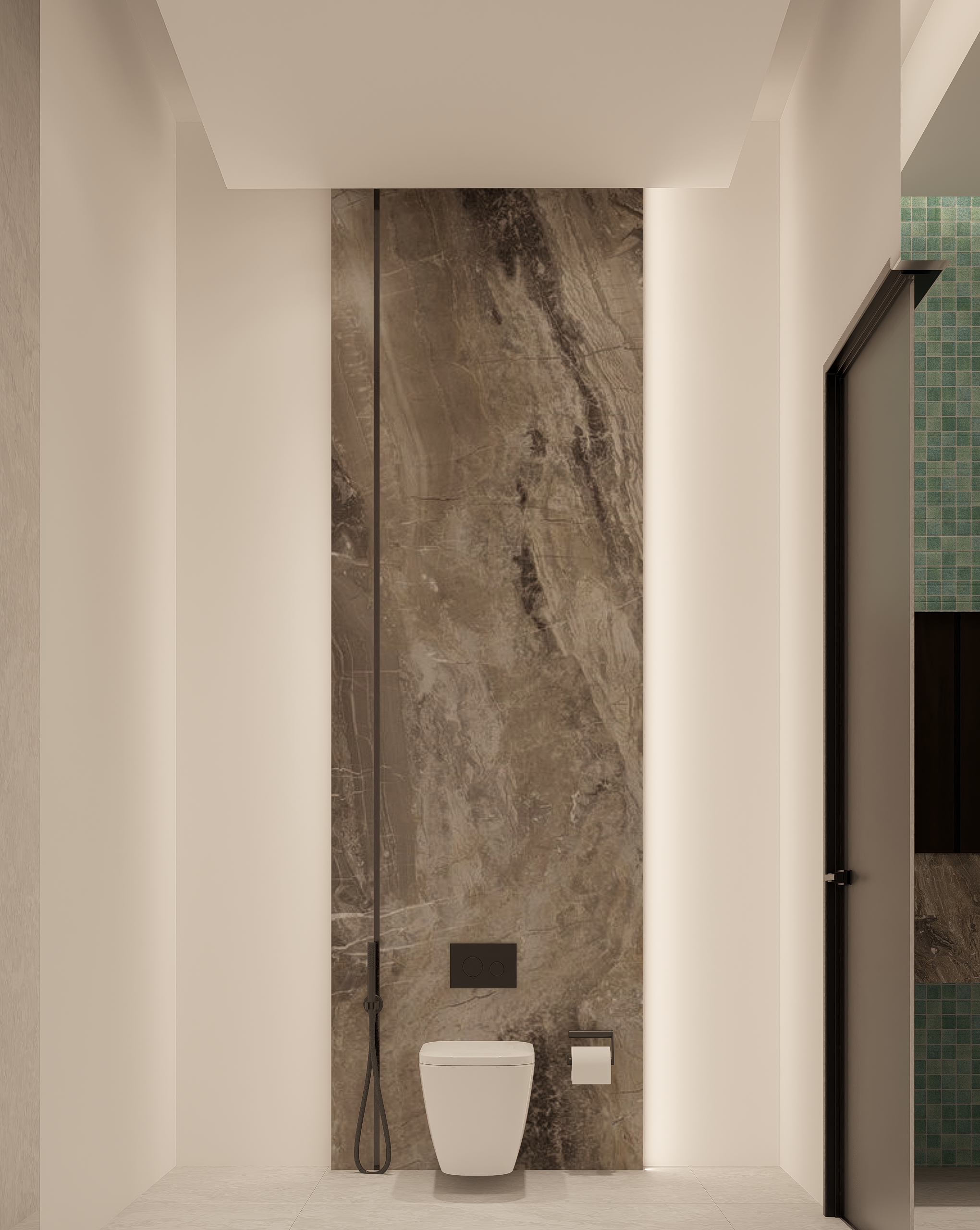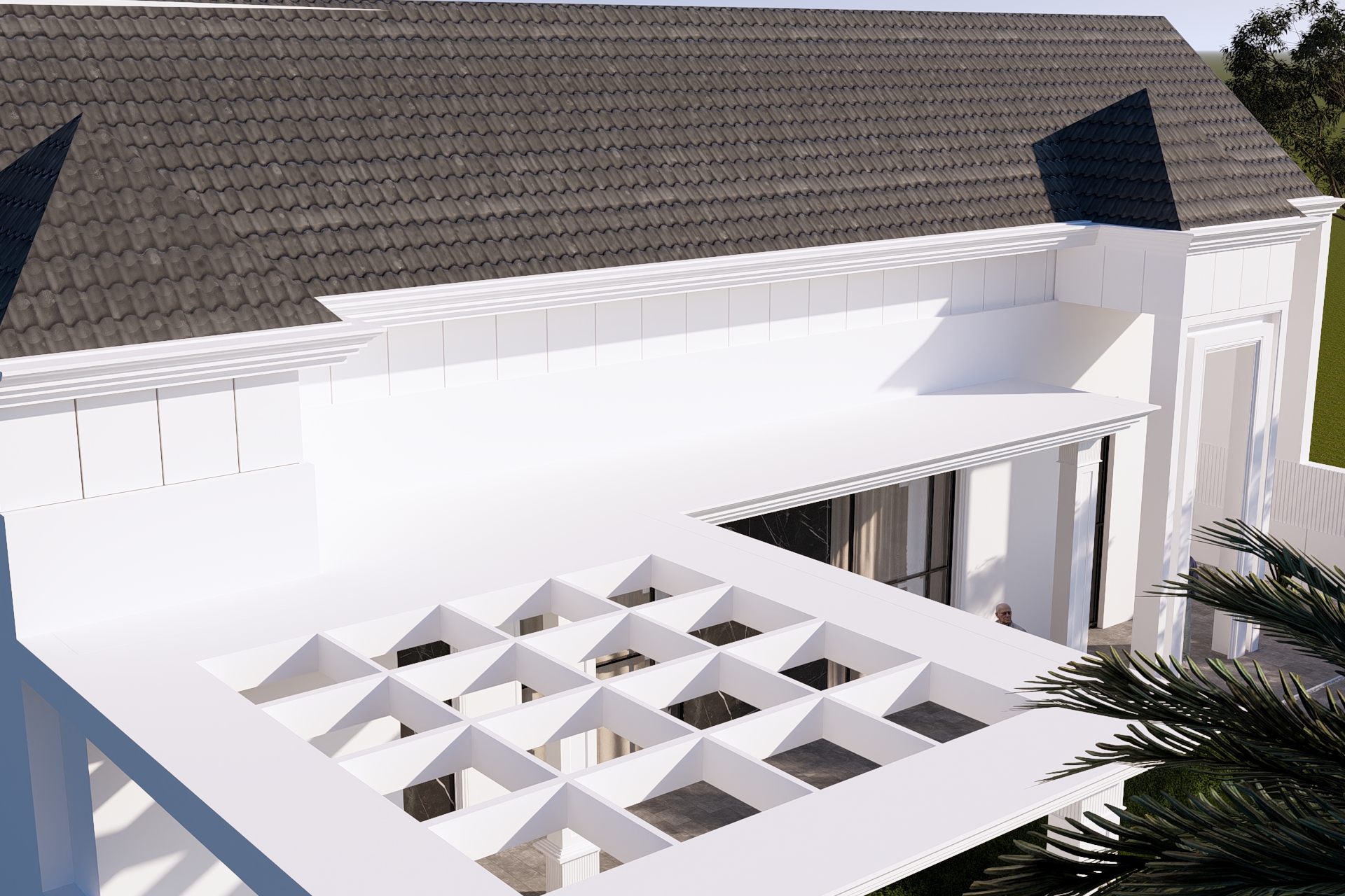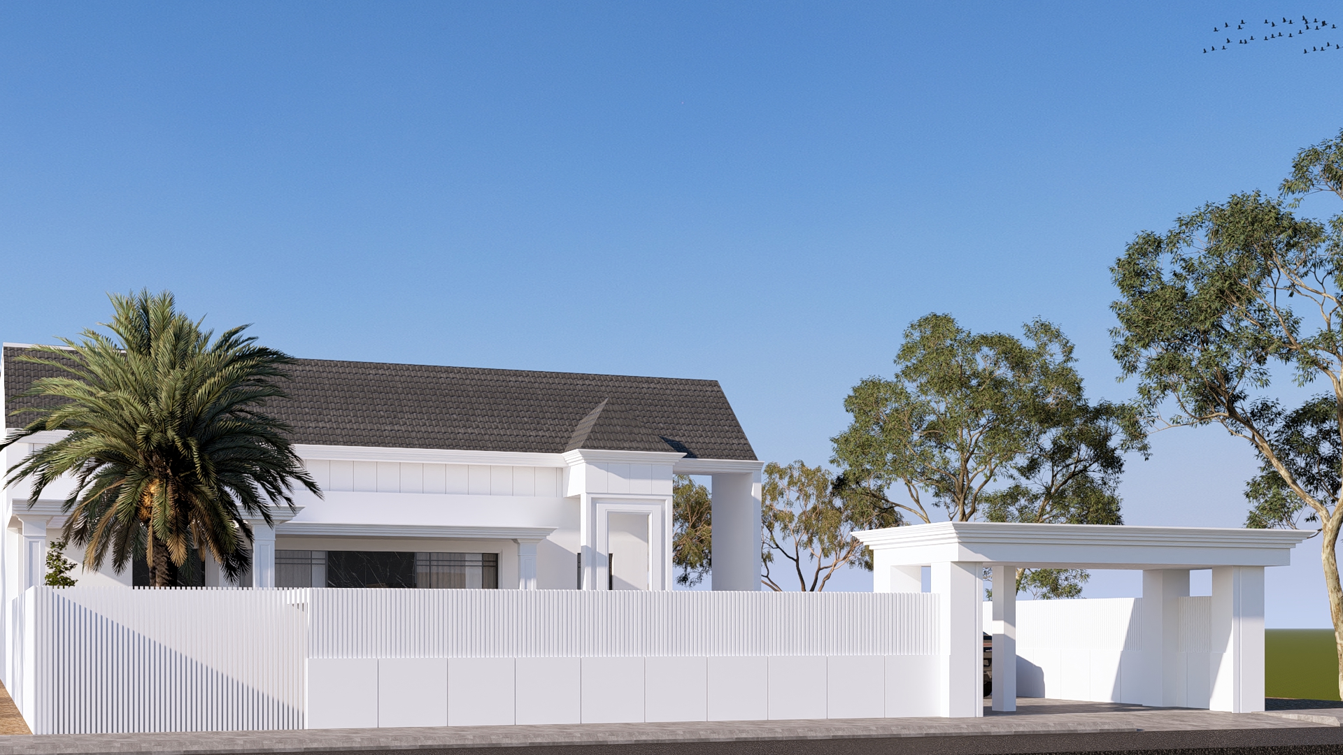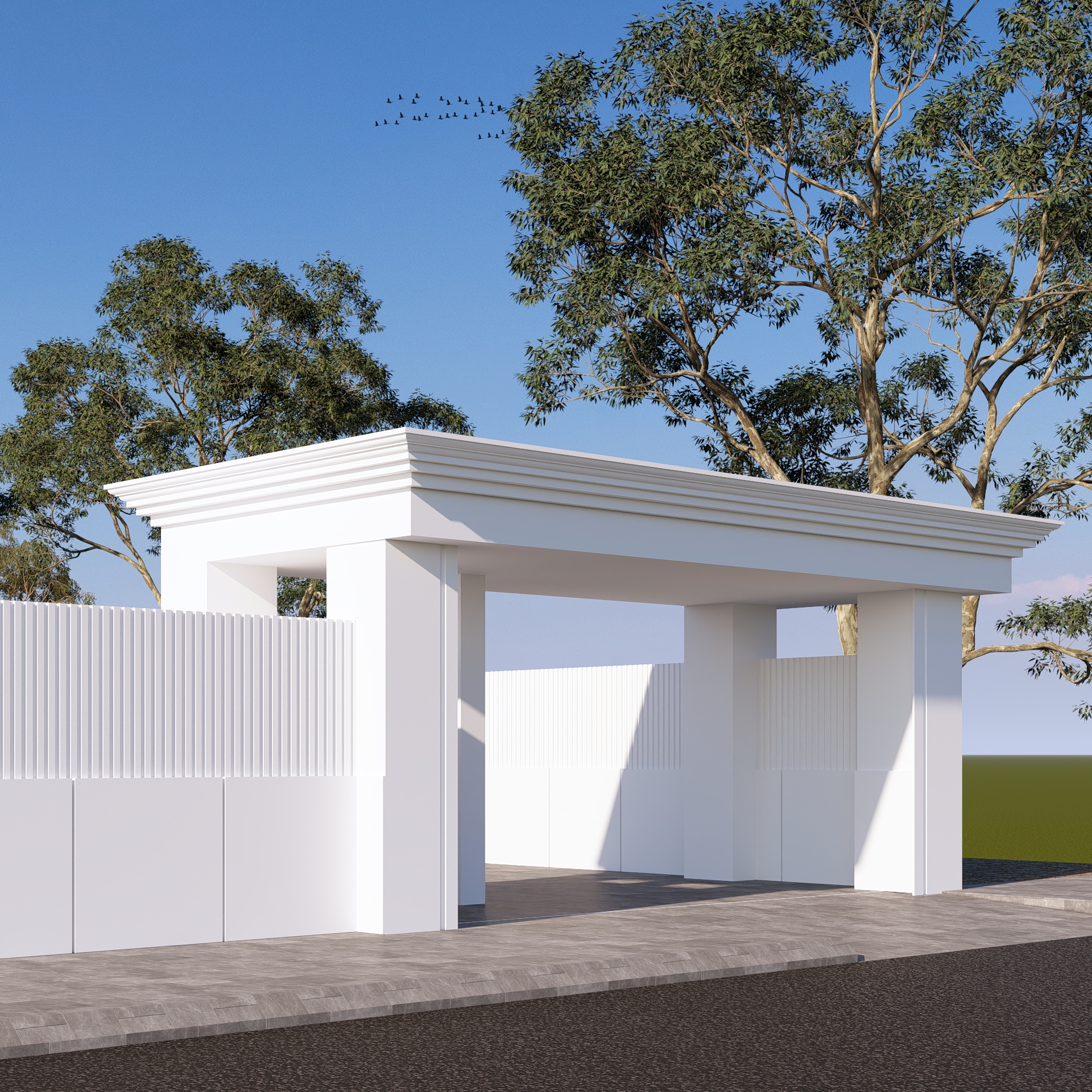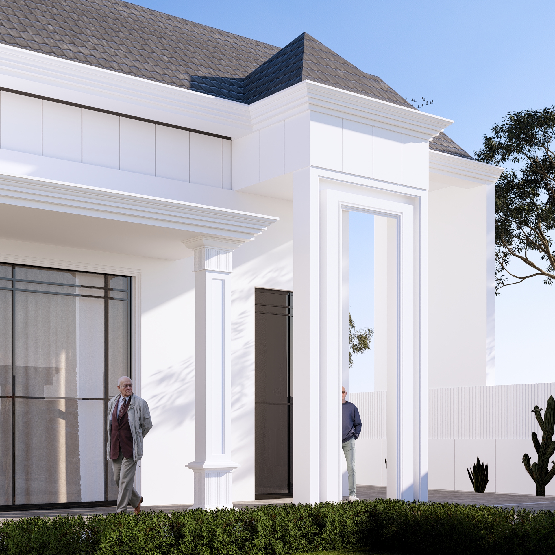 واجهة بتكوين هندسي متوازن تجمع بين الخطوط الكلاسيكية الهادئة واللمسات العصرية الأنيقة، حيث تبرز الأعمدة البيضاء بتفاصيل دقيقة تكمّل السقف المائل بلون رمادي أنيق يعتمد التصميم على تناغم الألوان والمواد بين الأبيض والرخام الأسود، ليمنح الواجهة حضوراً راقياً وعمقاً بصرياً واضحاً