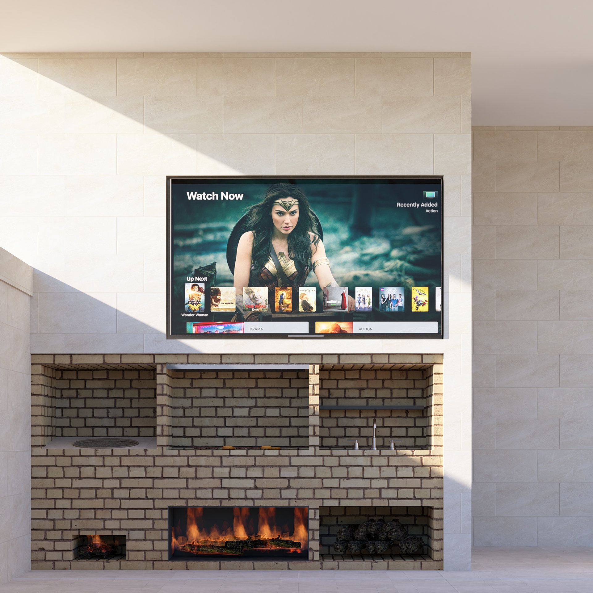 جلسة راقية تحت الظلال البيضاء، تتوسطها مدفأة أنيقة تمنح المكان طابعًا دافئًا ومريحًا طوال اليوم تم تصميم هذا الركن ليجمع بين البساطة العصرية والطابع الحميمي، مع تدرجات طبيعية من الأخضر والرمادي تمنح توازنًا بصريًا هادئًا تُعد هذه المساحة مثالية لقضاء الأمسيات الهادئة أو اللقاءات العائلية في أجواء تعكس فخامة التصميم المعماري وانسجامه مع الطبيعة المحيطة