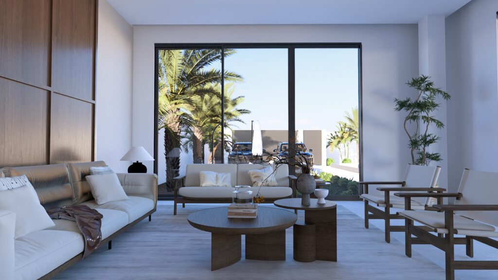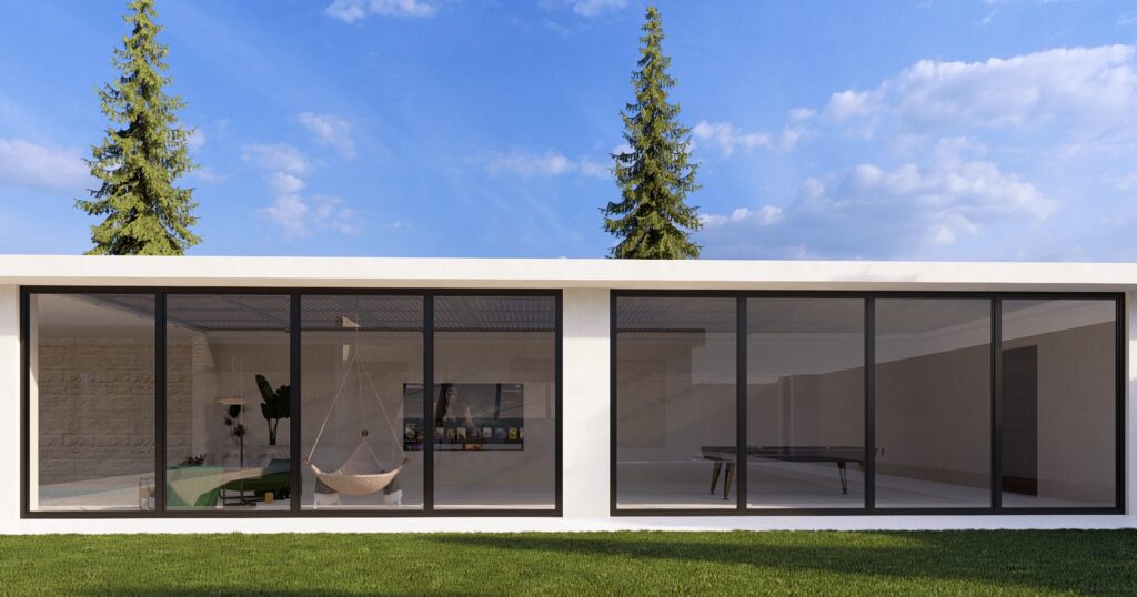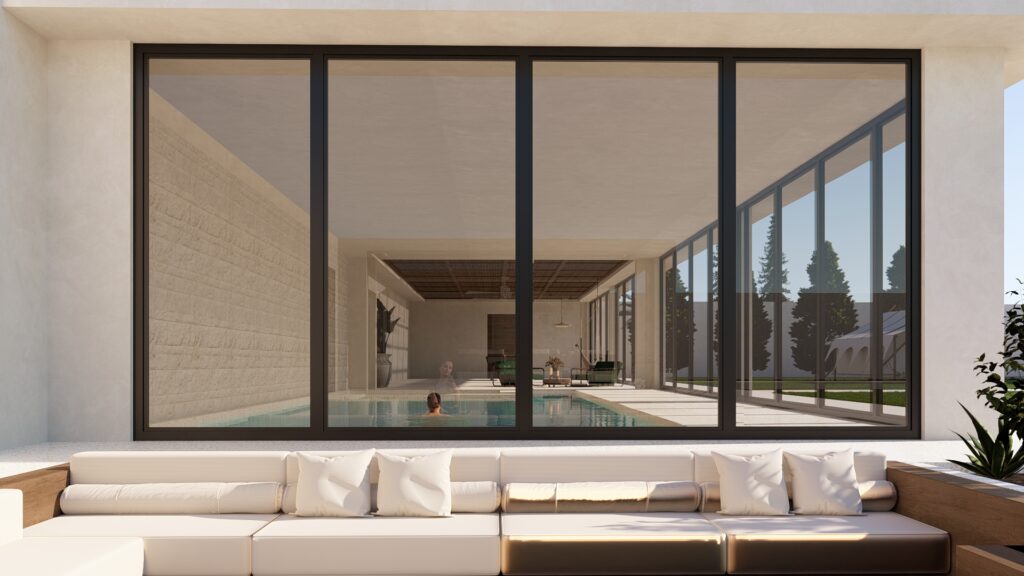 واجهات زجاجية واسعة ونوافذ بانورامية تسمح بدخول الضوء الطبيعي، وتربط كل فضاء داخلي بإطلالة مباشرة على المساحات الخارجية، مما يعزز الإحساس بالاتساع والراحة