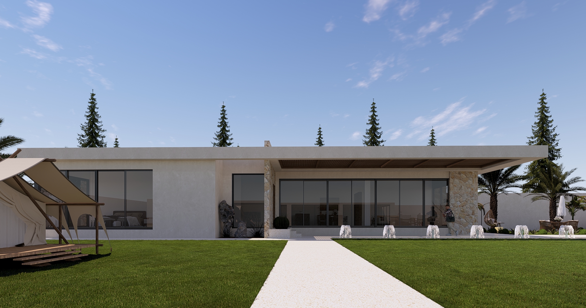 صالة استقبال رئيسية مفتوحة على مطبخ عصري، تسبق جناح غرف النوم الذي يضم غرفتي نوم ماستر واسعتين مع حمامات داخلية وخزائن مدمجة. تصميم زجاجي بانورامي يعزّز الإضاءة الطبيعية والربط البصري مع الحديقة