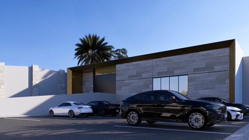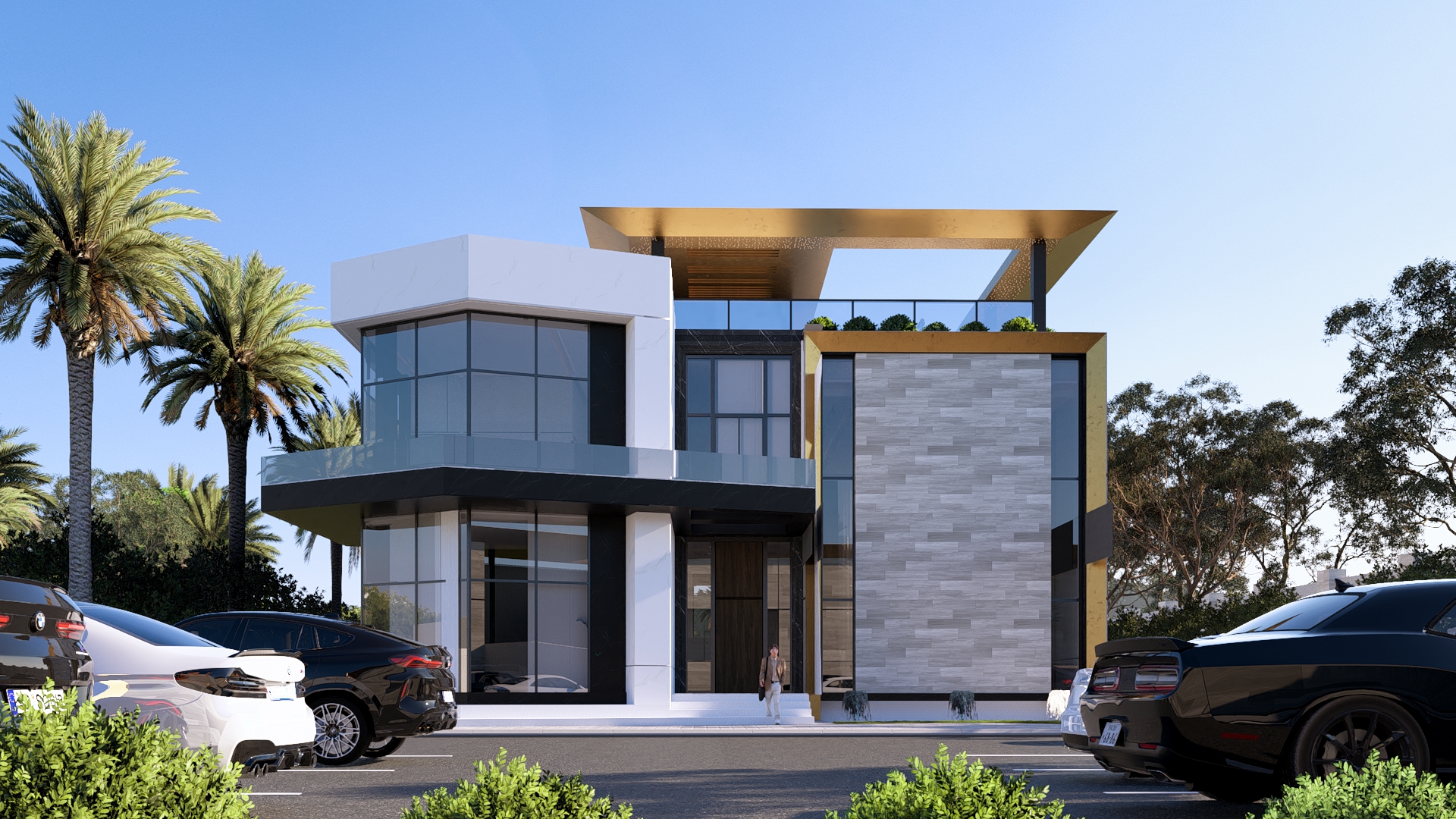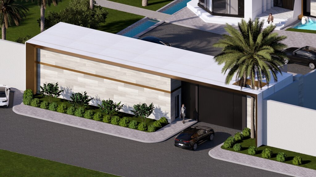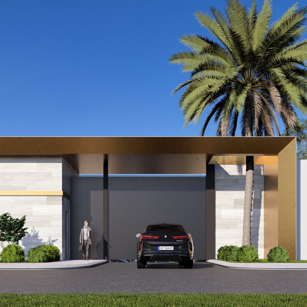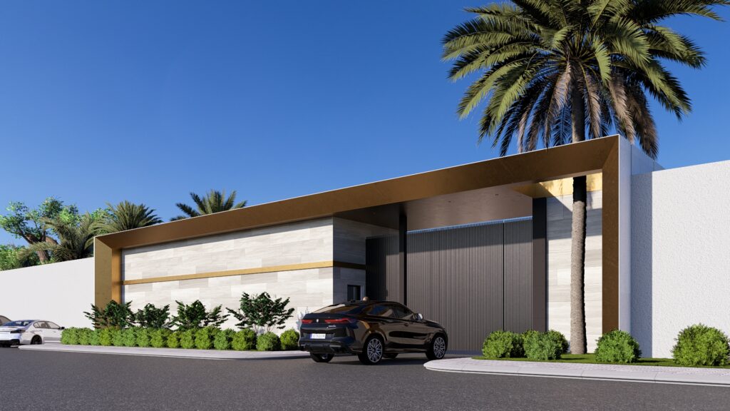 تصميم بواجهات طولية بخطوط معمارية عصرية، مع نوافذ زجاجية ممتدة تعزز الإضاءة الطبيعية وتفتح المشهد نحو الحديقة والمسبح. مدخل رئيسي واضح وبسيط يقود مباشرة إلى قلب الفيلا، ويمنح انطباعًا بالفخامة منذ اللحظة الأولى