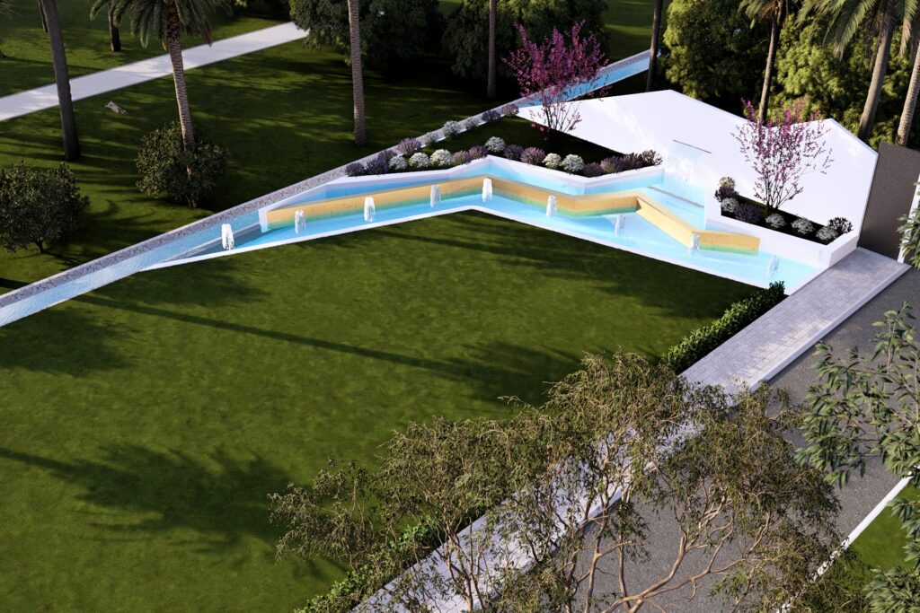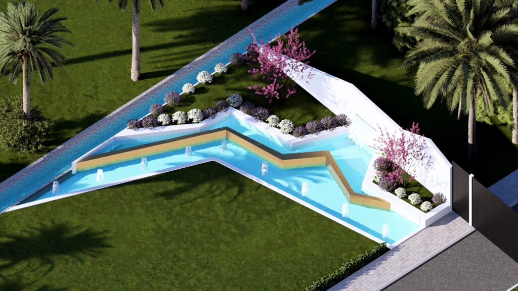 نافورات مائية ممتدة على طول الواجهة، مدمجة بتناغم مع التصميم الخارجي