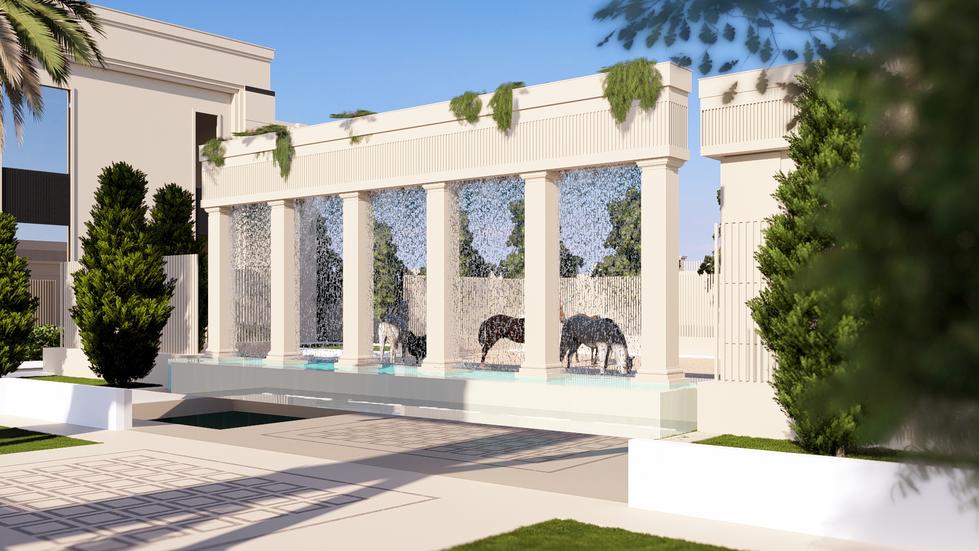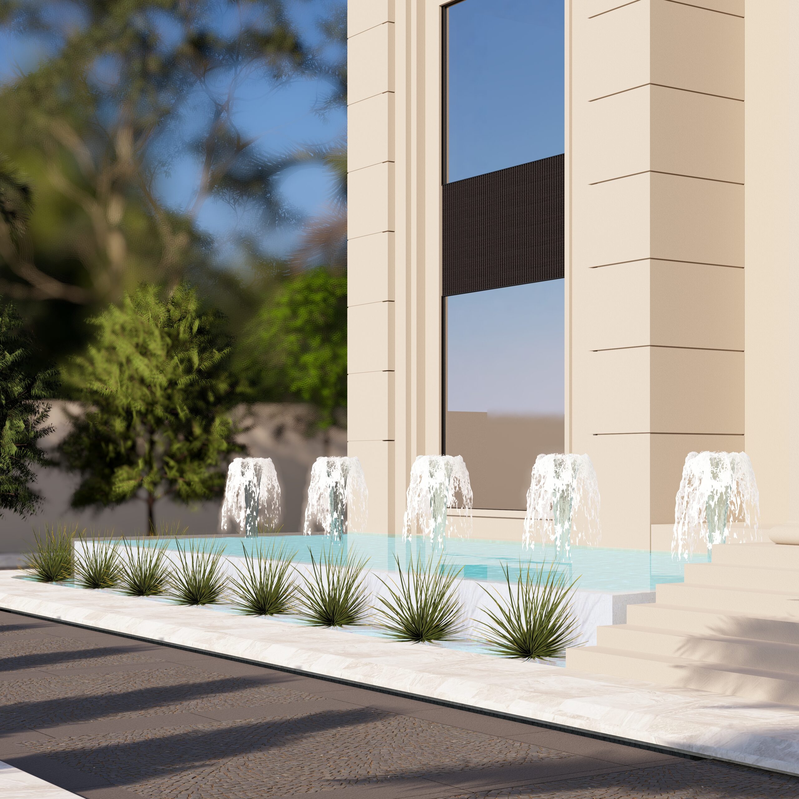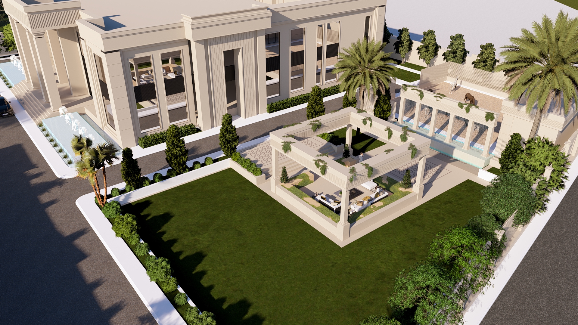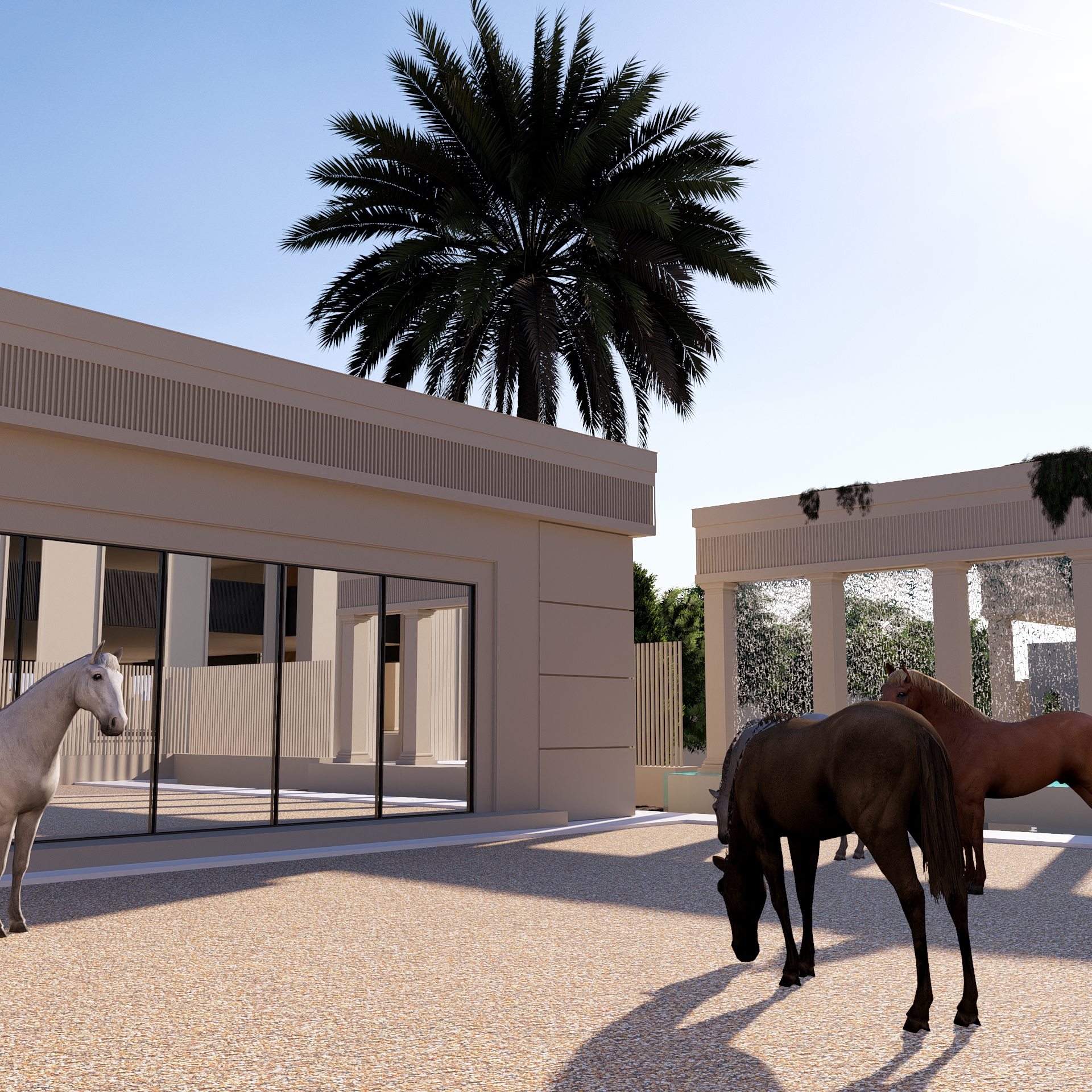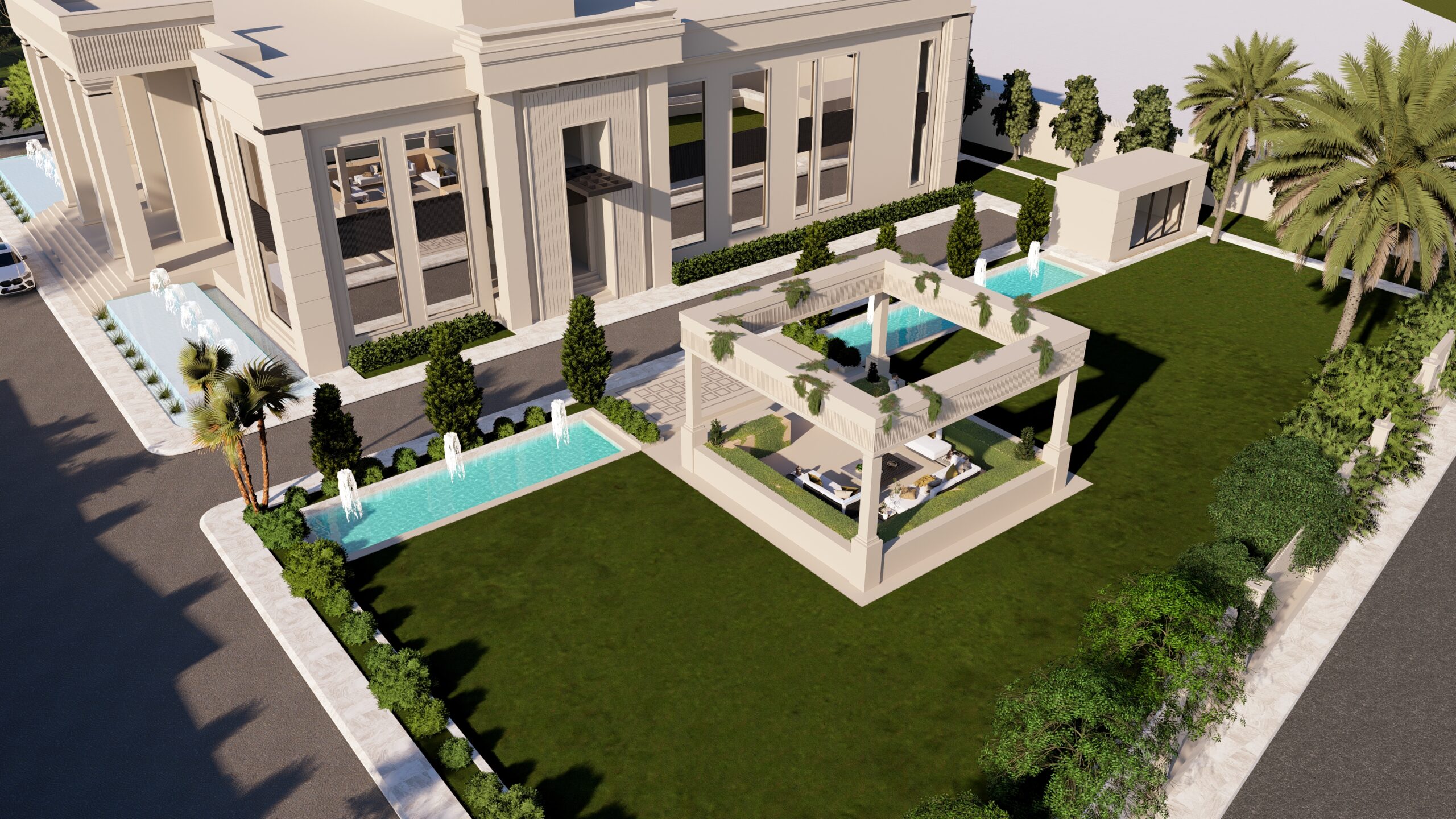 This upscale villa is located in the city of Basra on a 15,600-square-meter plot. It features a two-story residential building carefully designed to reflect a modern and luxurious lifestyle. The project was developed through a collaborative effort. A previous firm handled the architectural layout, facade, and concrete structure, while our office was responsible for developing the interior design and completely redesigning the landscape. Our scope also included designing the gate and organizing the external elements such as the horse stable, outdoor seating areas, bird enclosure, as well as modifying the architectural plans and the swimming pool.