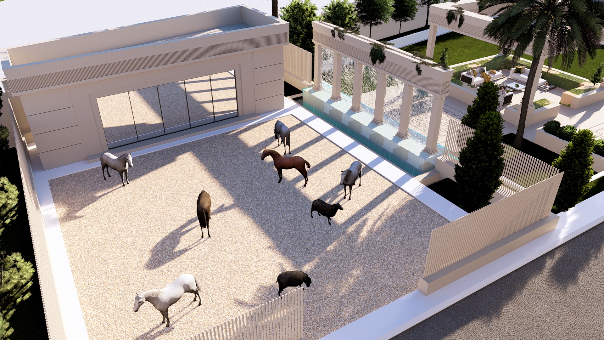 Upon entry, the villa stands prominently at the center. To the right, there are parking spaces that accommodate up to seven cars. On the left, there’s a dedicated area for horses with a private stable, and a side driveway allows vehicles to reach the rear of the site.