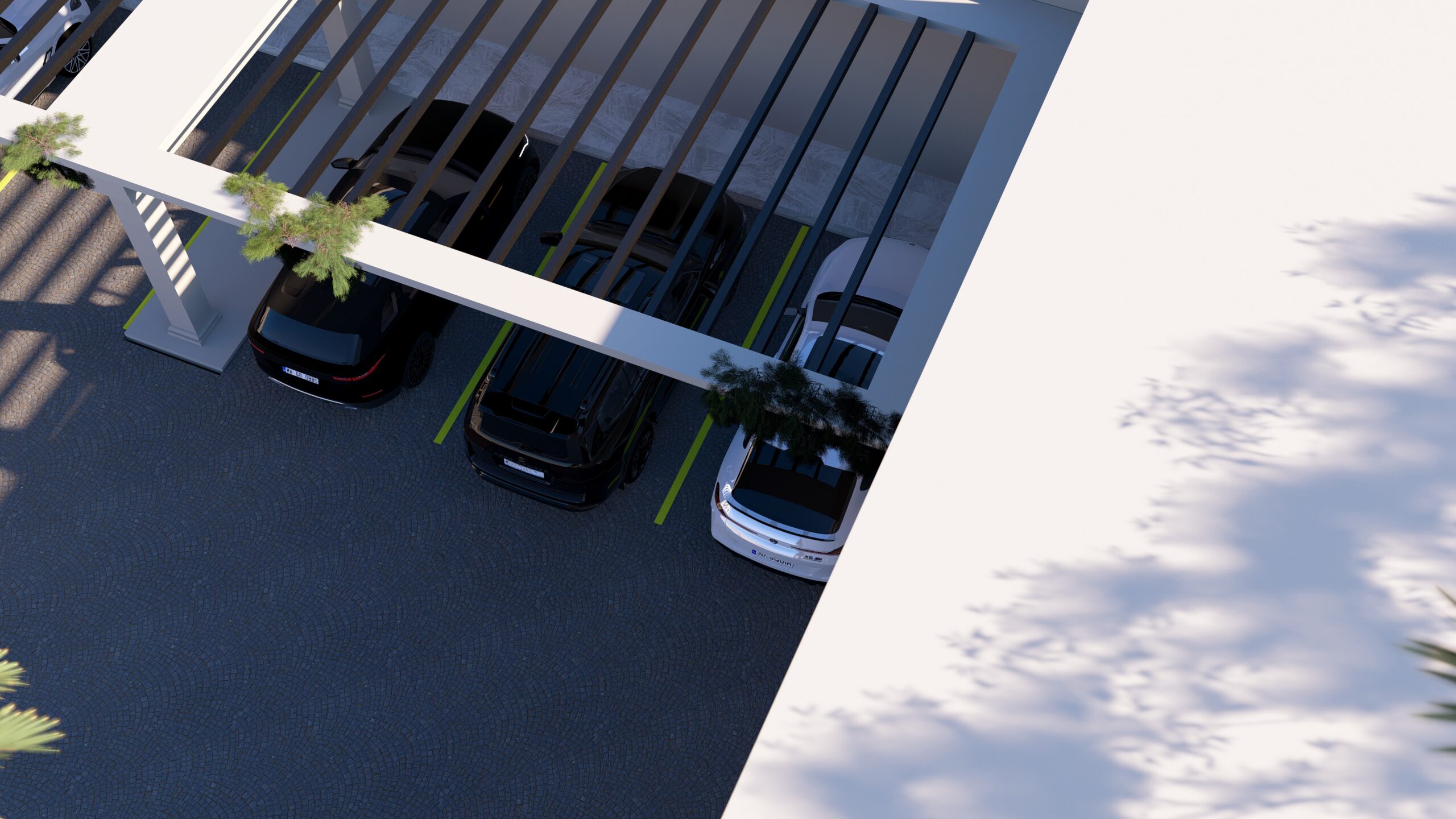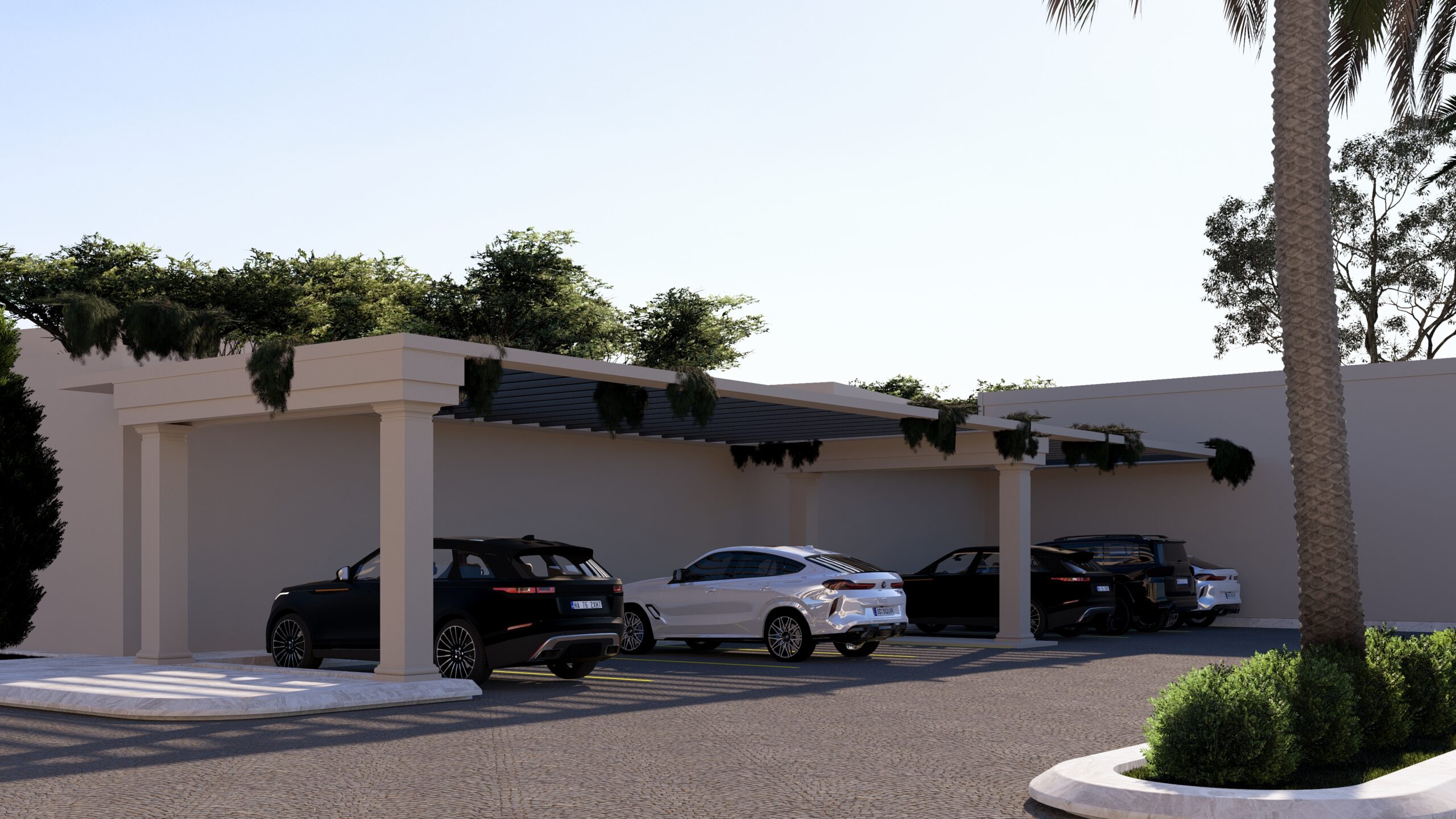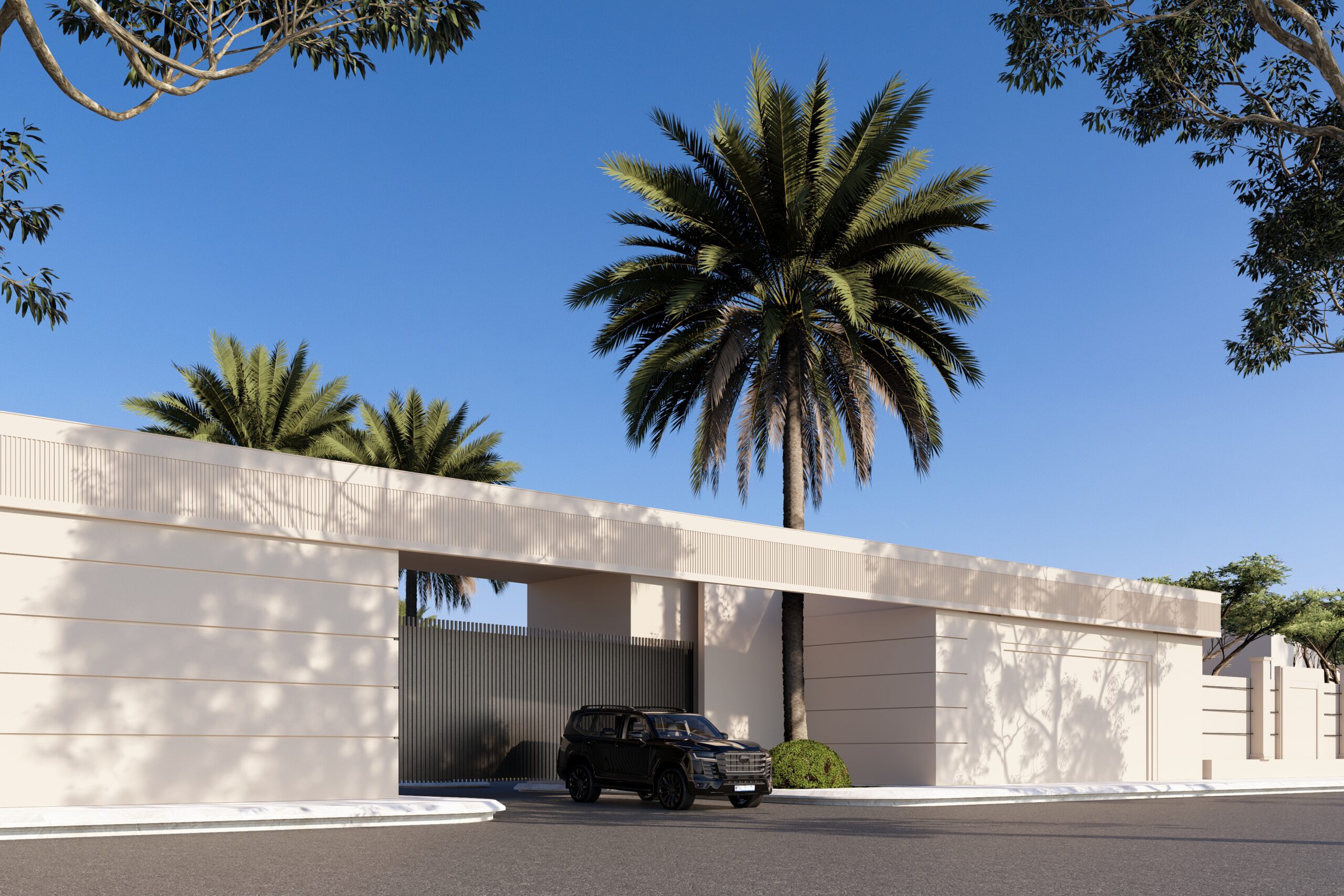 Access to the villa begins through a main gate that combines functionality with visual appeal. One side of the gate includes a guardhouse, while the opposite side accommodates control and electrical rooms.