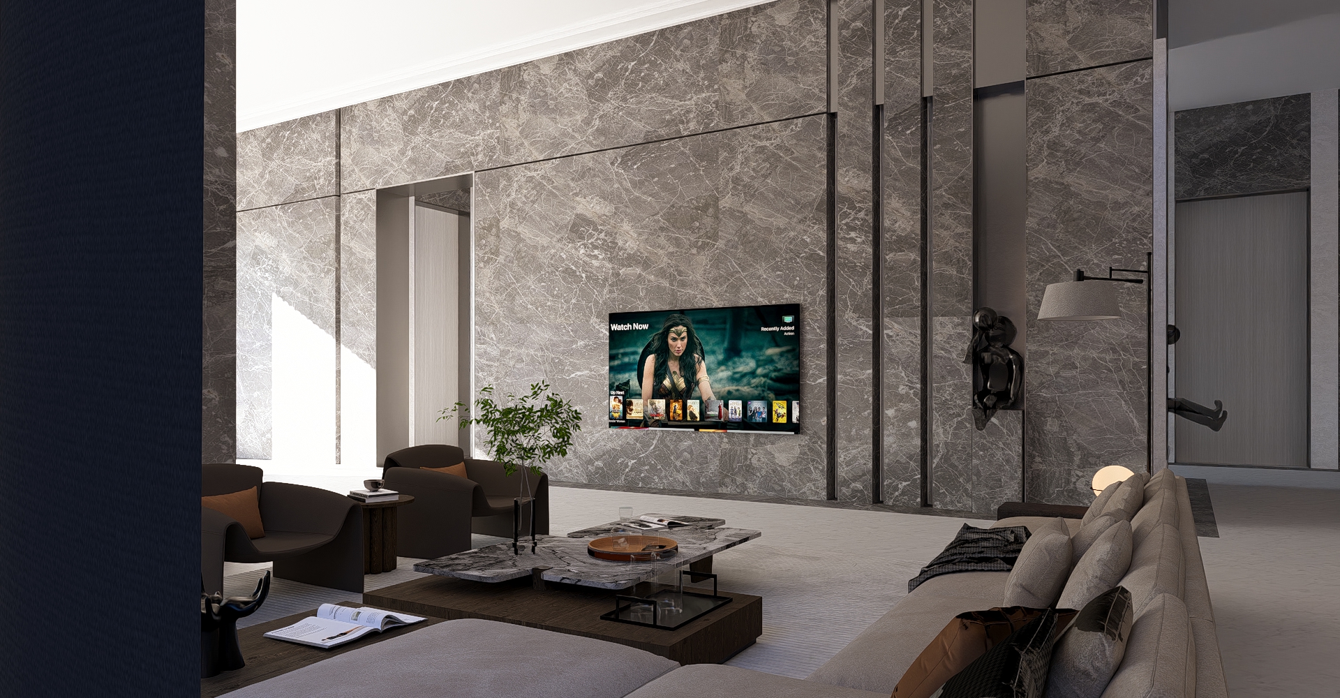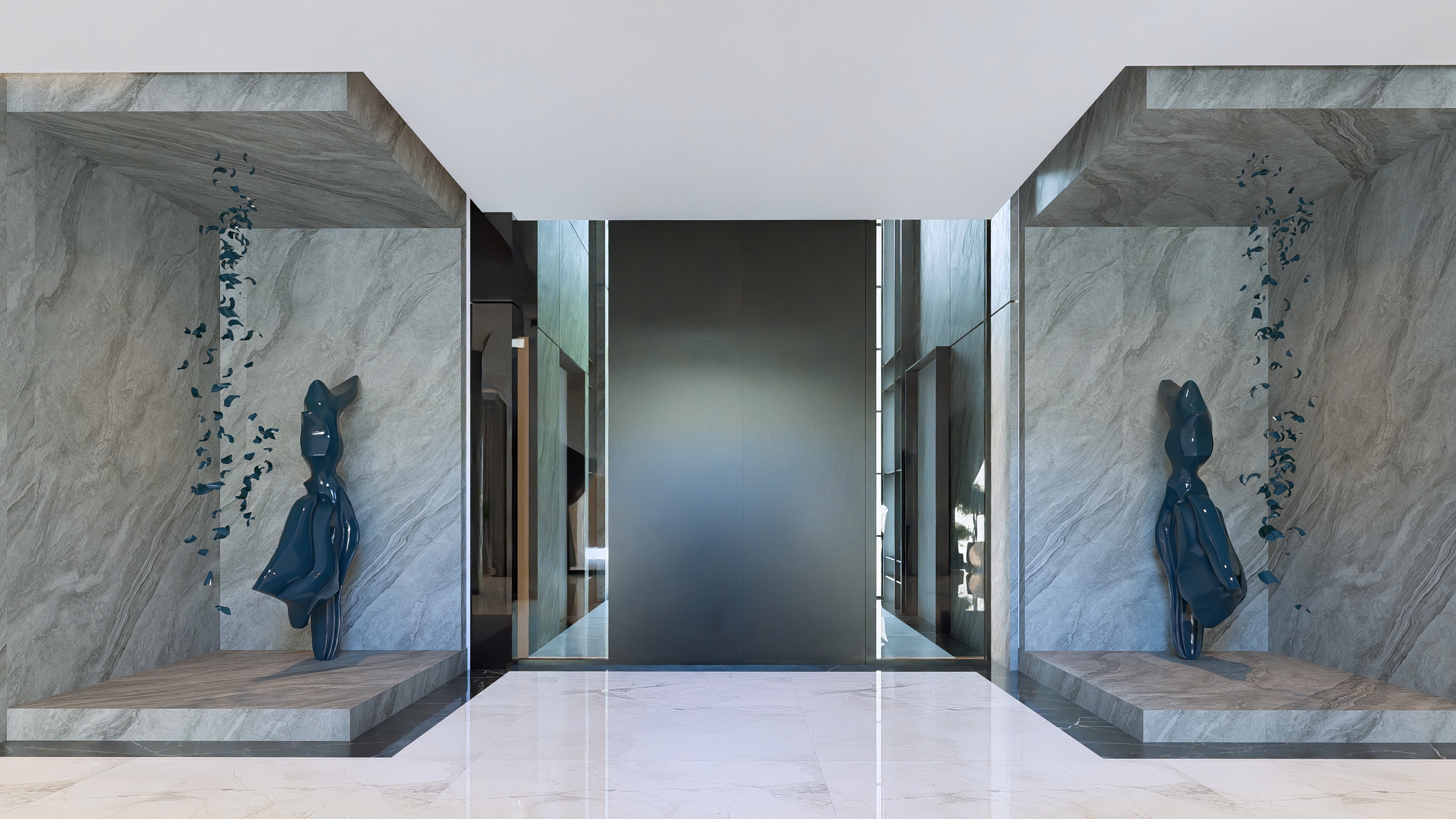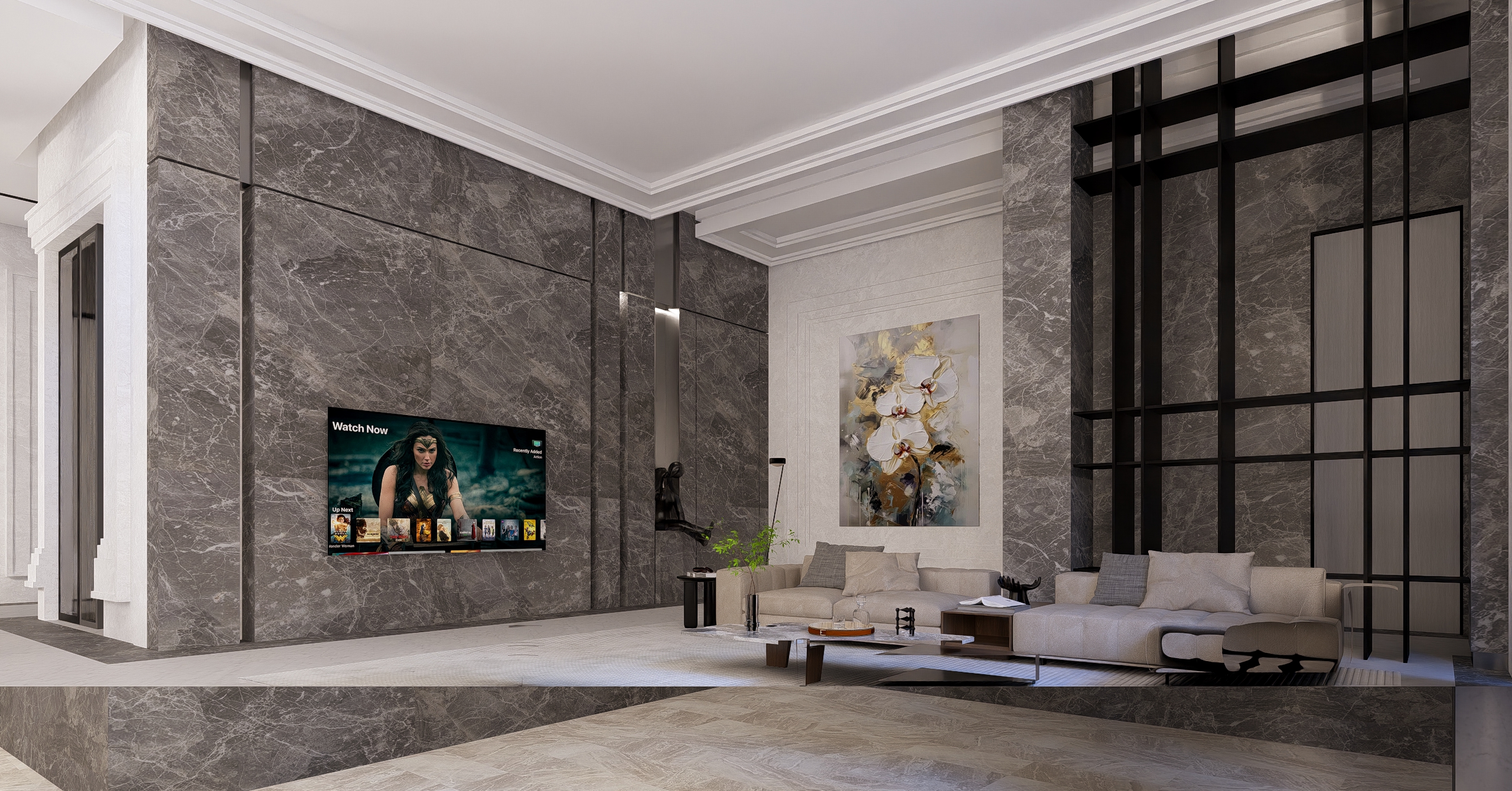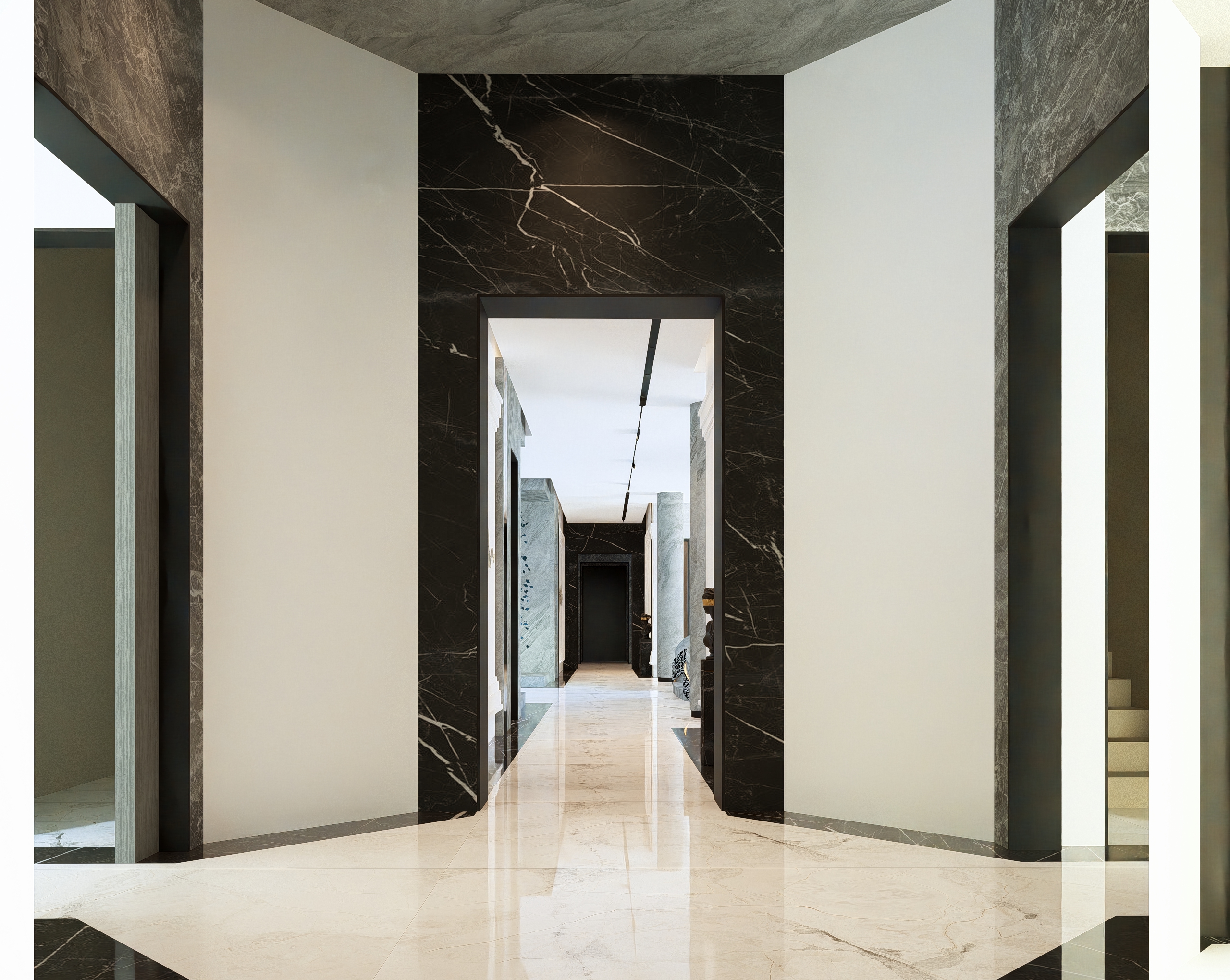 Access to the villa begins through a main gate that combines functionality with visual appeal. One side of the gate includes a guardhouse, while the opposite side accommodates control and electrical rooms.