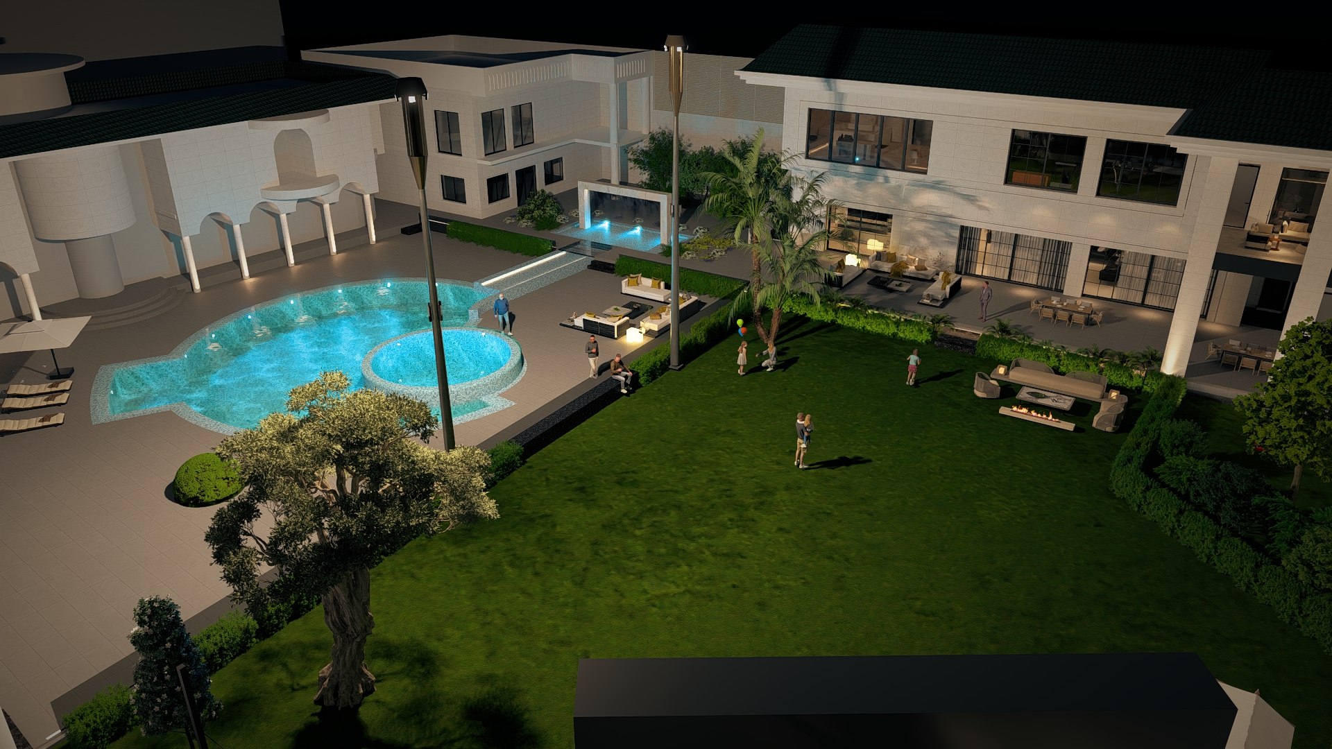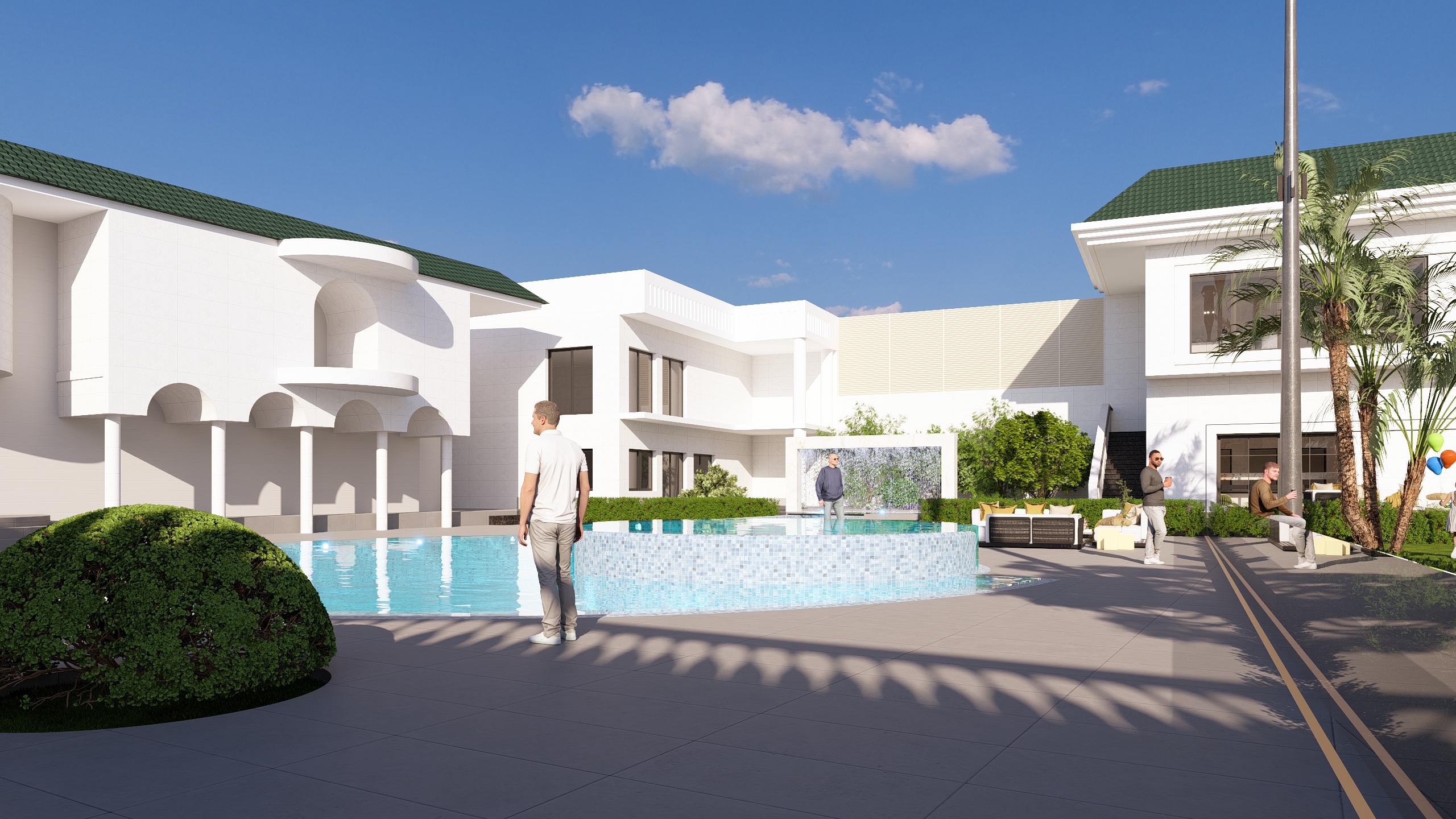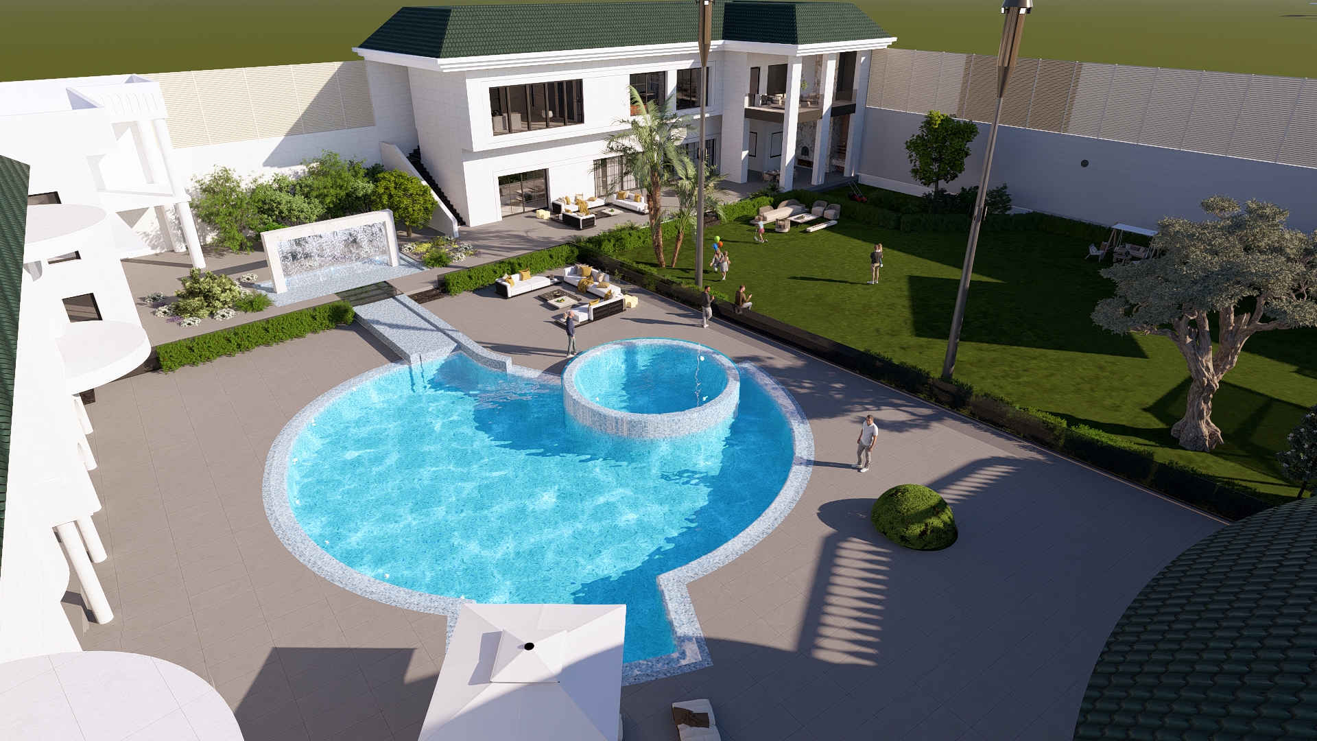 ويكمل المشهد مسبح خارجي واسع يشكل نقطة محورية بين الطبيعة والعمارة