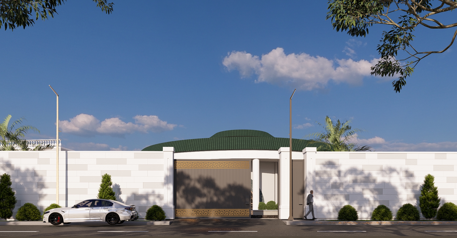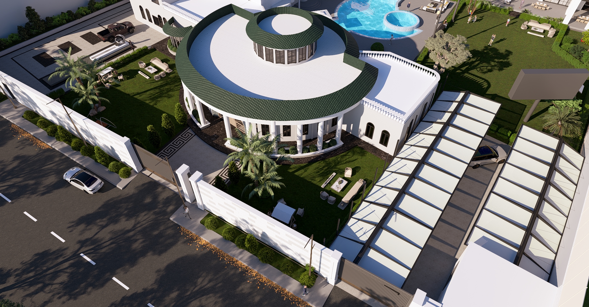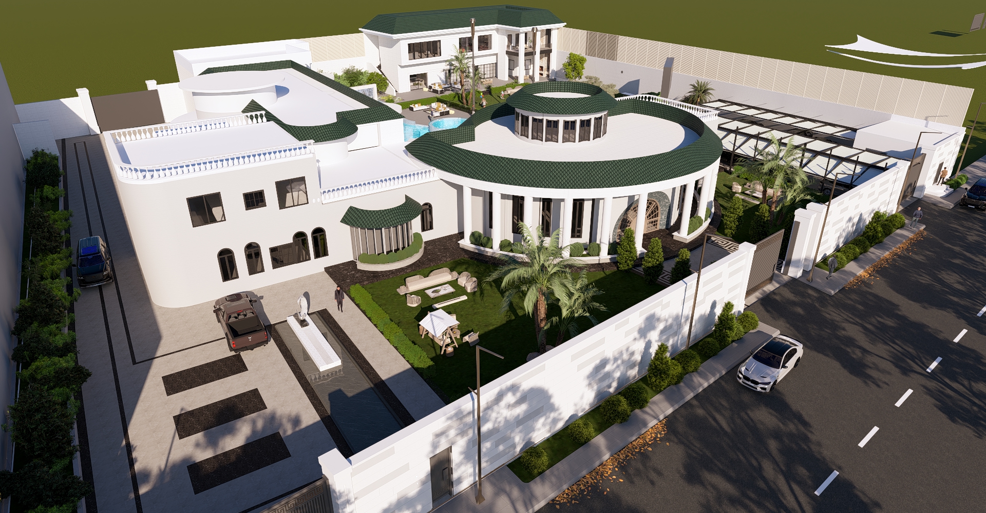تتميز الفيلا بتصميم كلاسيكي مهيب ذي كتلة معمارية واحدة تتوسط الموقع، محاطة بمساحات خضراء ومسبح خارجي يمنحها حضوراً فريداً وخصوصية تامة الواجهة الأمامية تُبرز التكوين الدائري والأعمدة البيضاء التي تعكس الطابع الملكي للمبنى، بينما تضيف النوافذ الممتدة لمسة عصرية تمنح الضوء والاتساع
