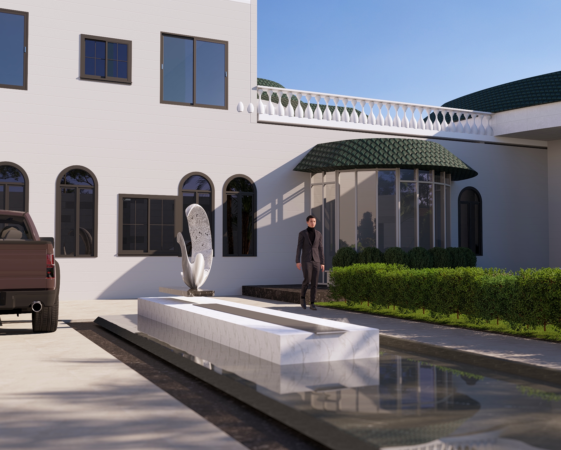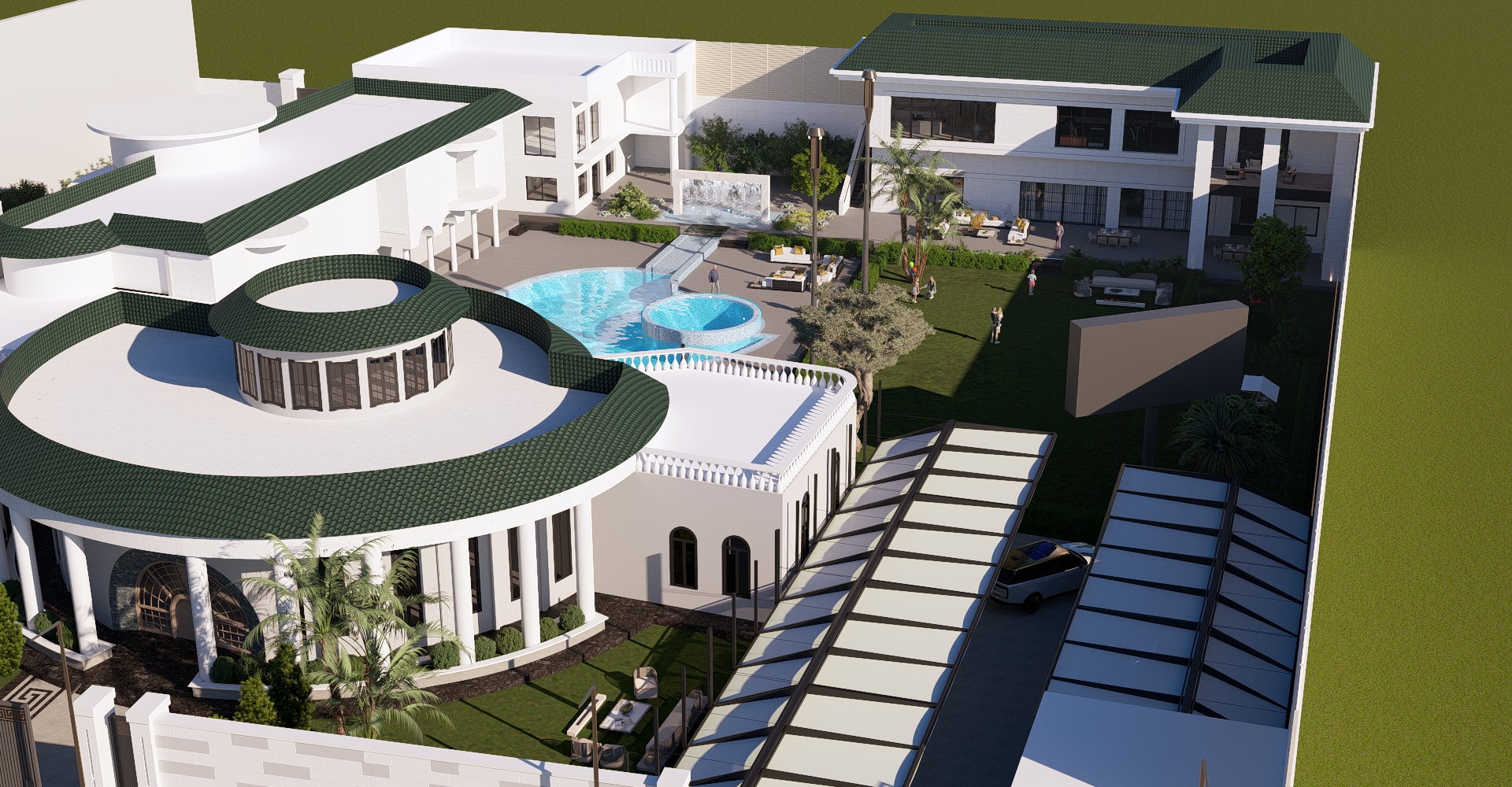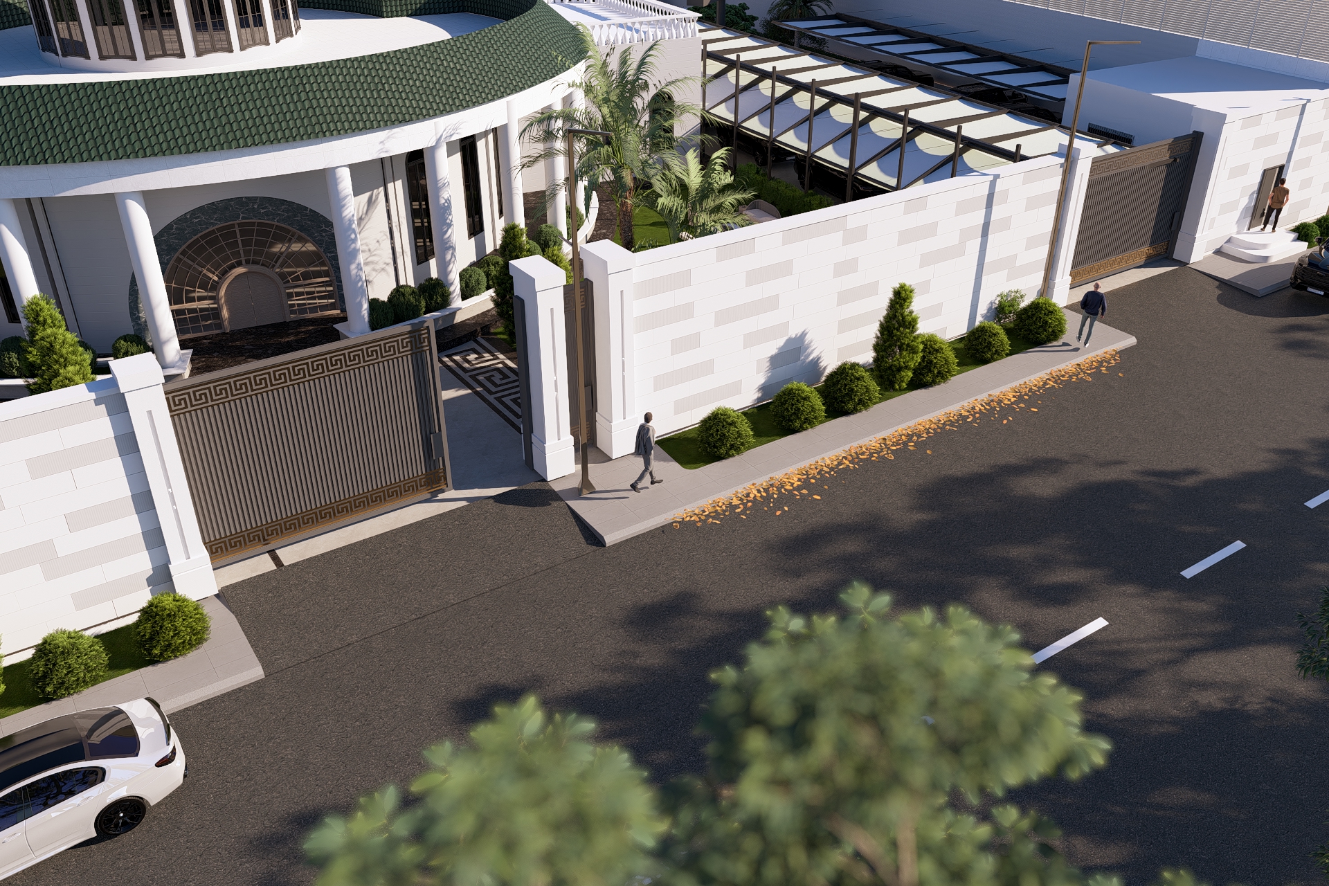 تتميز الفيلا بتصميم كلاسيكي مهيب ذي كتلة معمارية واحدة تتوسط الموقع، محاطة بمساحات خضراء ومسبح خارجي يمنحها حضوراً فريداً وخصوصية تامة الواجهة الأمامية تُبرز التكوين الدائري والأعمدة البيضاء التي تعكس الطابع الملكي للمبنى، بينما تضيف النوافذ الممتدة لمسة عصرية تمنح الضوء والاتساع