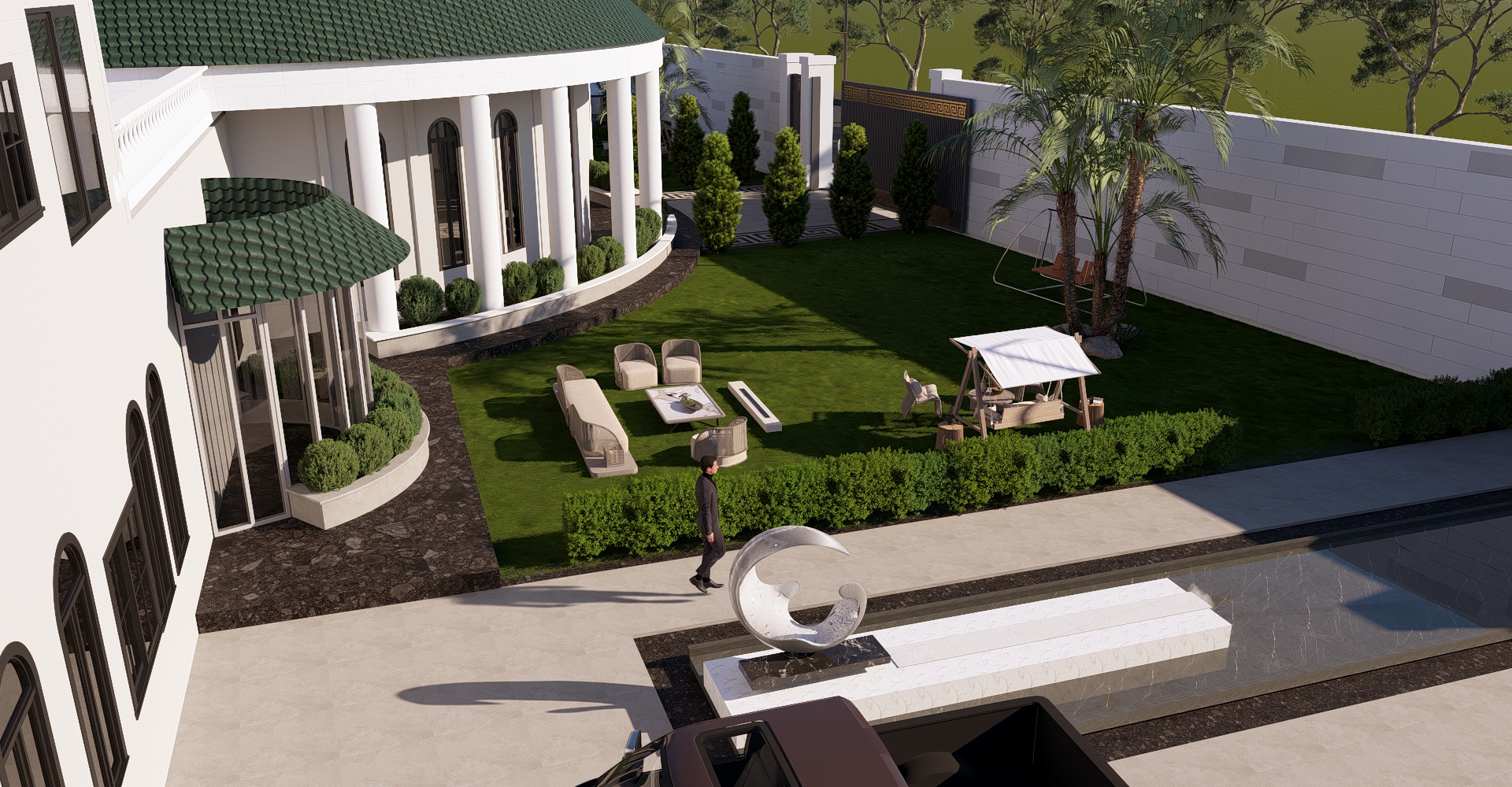 تُحيط بالفيلا حديقة منسقة وجلسات خارجية مخصصة للاسترخاء والاستقبال، مع توزيع نباتي متوازن ينسجم مع الطراز الكلاسيكي العام