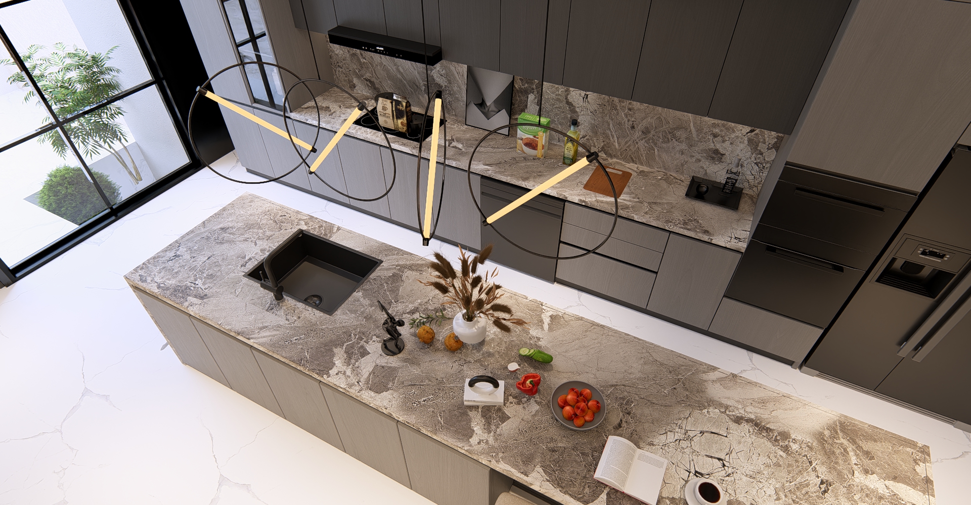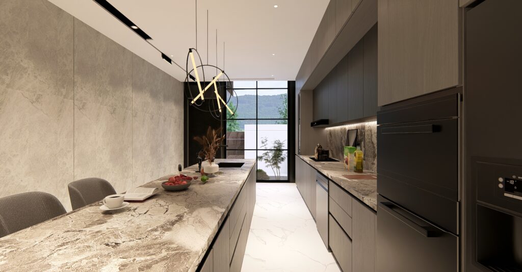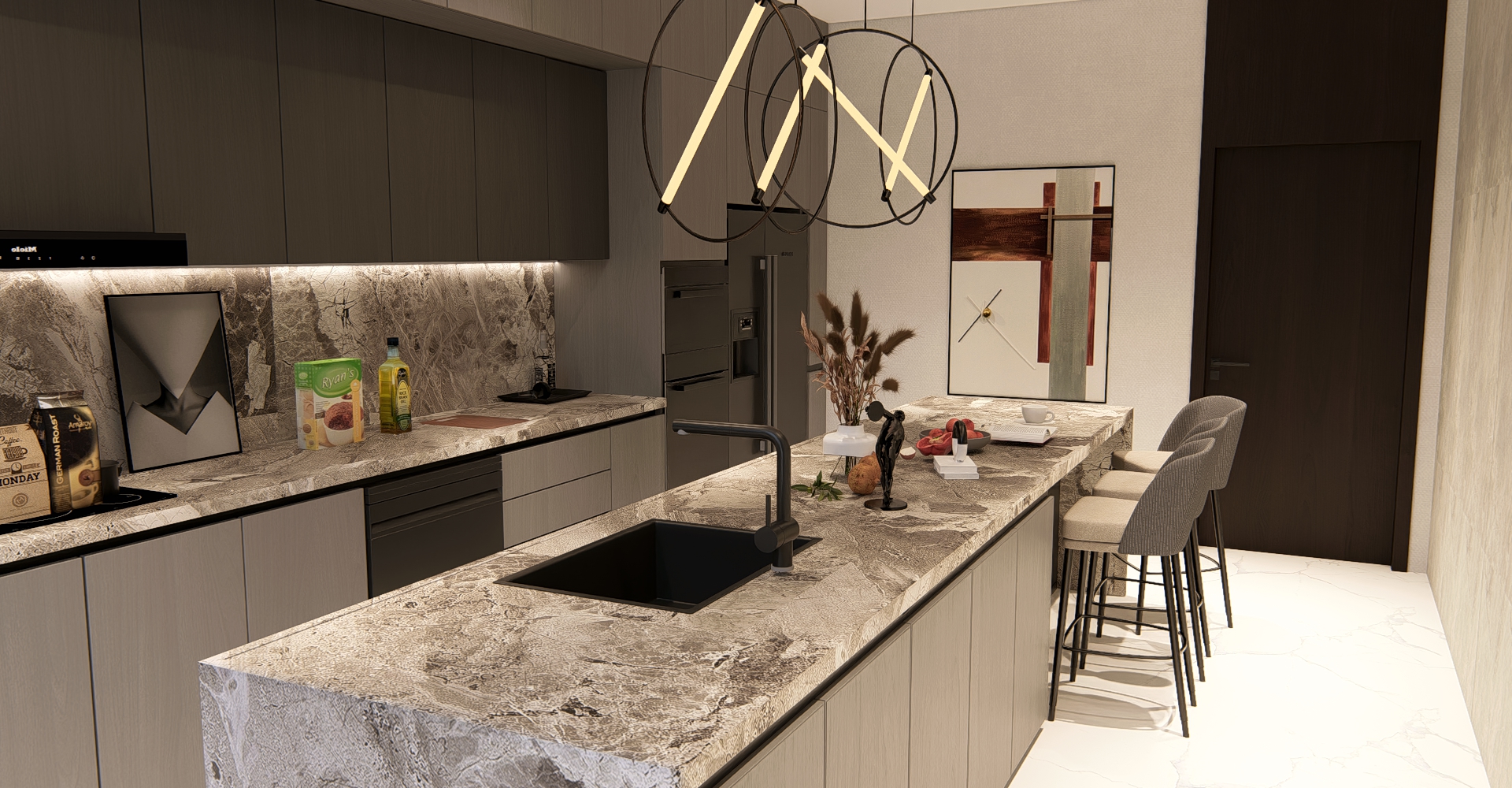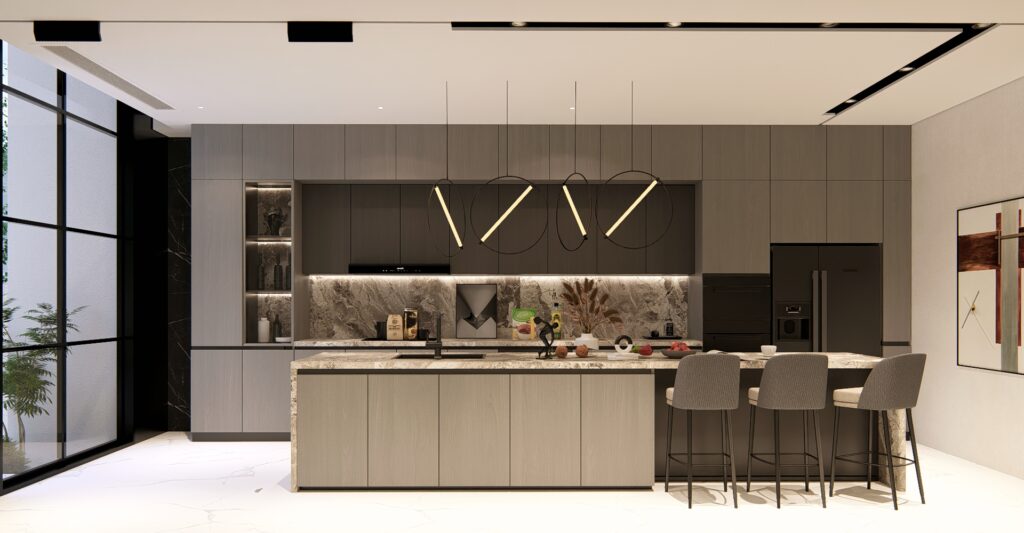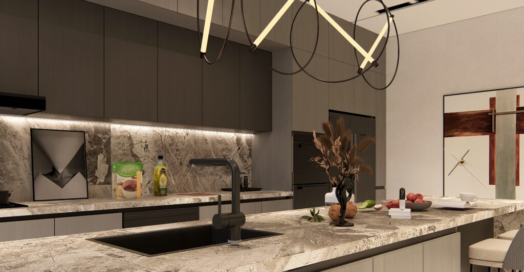 بعد عبور منطقة الضيافة، يقود ممر داخلي أنيق إلى مساحة الاستقبال المركزية لكل وحدة، حيث يتوسط التصميم درج داخلي يؤدي إلى الطابق العلوي